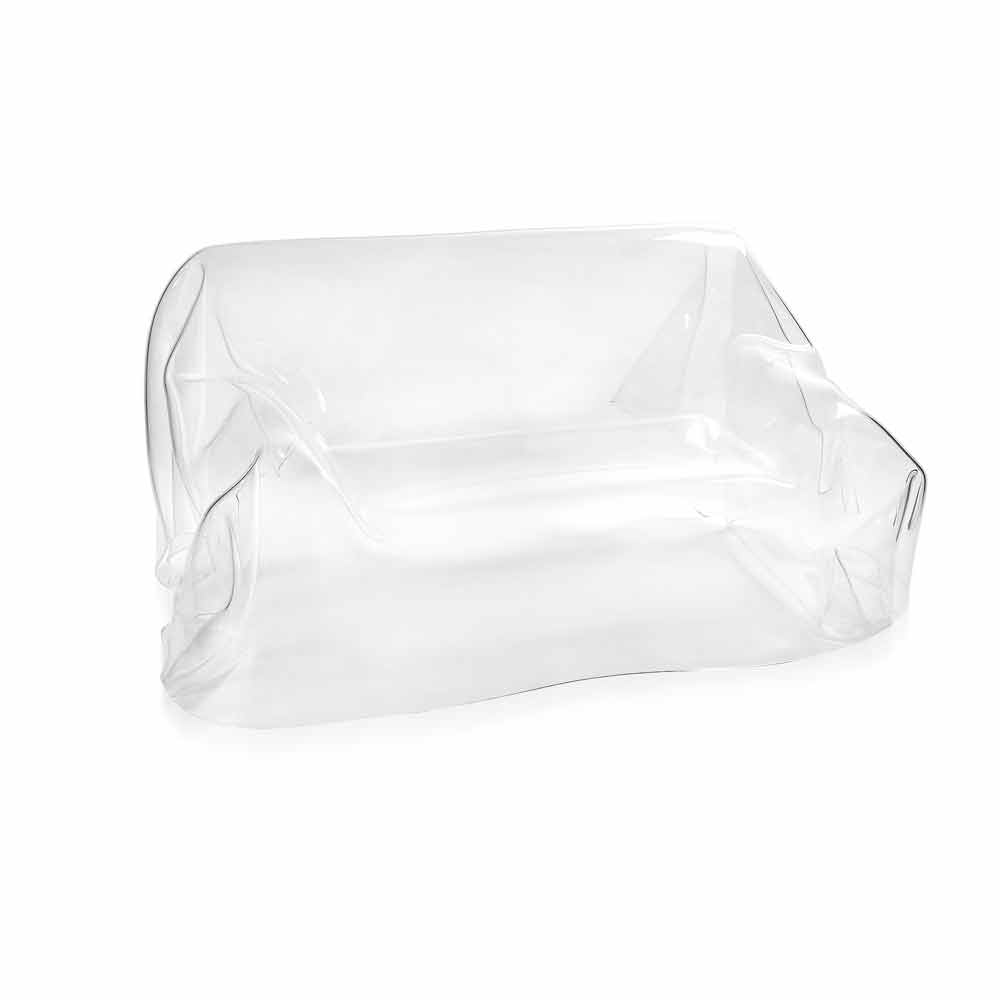 Das drapierte Sofa Jolly ist ein Unikat. Aus einer 100% reinen Polymerfolie aus transparentem PMMA-Plexiglas, vollständig von Hand drapiert, entsteht ein einzigartiges und unwiederholbares Sofa. Die gebaute Struktur ist völlig selbsttragend und bietet Platz für 2 Personen. Die physikalisch-technischen Eigenschaften von Plexiglas (stoßfest, nicht verformbar, unveränderlich, wärmeisolierend) machen diesen Artikel zu einem praktischen und funktionellen Möbelstück, das für jede Umgebung geeignet ist. Die Helligkeit und Helligkeit werden über die Zeit konstant und unverändert beibehalten. Das PMMA Plexiglas aus reinem Polymer ist ungiftig, hypoallergen, geruchlos und antibakteriell. 100% recycelbar. Entworfen, entworfen und hergestellt in Italien, mit italienischen Materialien.