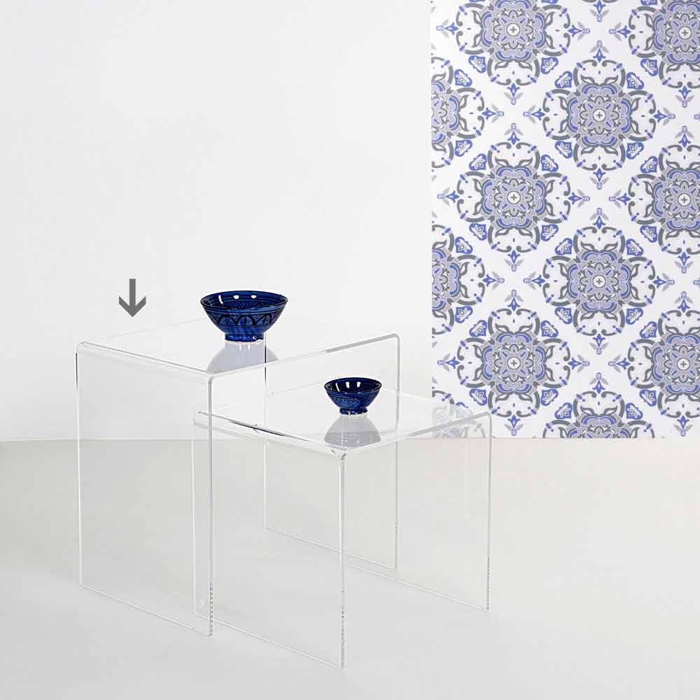 Modernes Design transparenter Tisch 50x50cm Terry Big, made in Italy Vielseitiger Couchtisch / Nachttisch, inspiriert von der Geometrie der 80er Jahre, in PMMA Plexiglas aus 100% reinem Polymer, lasergeschnitten und bei hohen Temperaturen gebogen. Die wichtige Dicke macht die Struktur völlig selbsttragend. Es kann einzeln verkauft werden, ist aber perfekt, wenn es mit den TERRY SMALL Zwillingen kombiniert wird. Plexiglas ist stoßfest, nicht verformbar, unveränderbar und wärmeisolierend. Die Helligkeit und Helligkeit werden über die Zeit konstant und unverändert beibehalten. Das PMMA Plexiglas aus reinem Polymer ist ungiftig, hypoallergen, geruchlos und antibakteriell. 100% recycelbar. Entworfen, entworfen und hergestellt in Italien, mit italienischen Materialien.