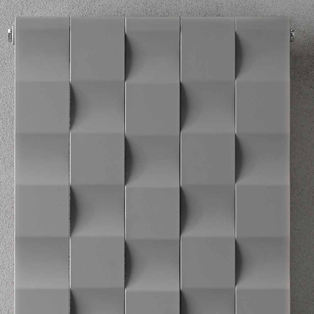 hydraulische Wandheizkörper hat ein modernes Design, das durch eine durch Subtraktion erzeugte Oberfläche gekennzeichnet ist, die dem Körper Wärmeverleiht.