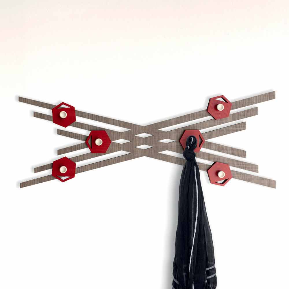 An der Wand montierte Garderobe, modernes Design aus farbigem Holz, hergestellt in Italien.