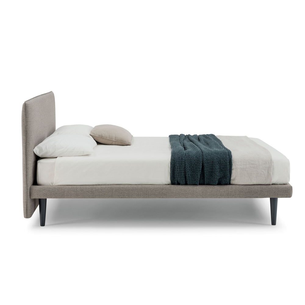 Designer-Doppelbett mit dünnem Untergestell, Gaya New von Bolzan Das Doppelbett Gaya New mit zeitgenössischem Design zeichnet sich durch eine dünne Basis aus, die dazu beiträgt, minimale und essentielle Linien nachzubilden. In diesem Bett wird Funktionalität mit Ästhetik kombiniert, einfach und sauber, ohne überflüssige Details. Es ist jedoch in der Lage, der Umgebung Komfort und Persönlichkeit zu verleihen. Es ist vollständig abnehmbar. Die Struktur besteht aus MDF- Holz (Abkürzung für Medium Density Fibreboard, d. h. Holzfaserplatte mittlerer Dichte) mit einer Dicke von 40 mm, überzogen mit Polyurethanschaum ohne Fluorchlorkohlenwasserstoffe gemäß UNI-Normen und ausgekleidet mit lichtbeständigem Velfodera. Das Bett wird mit einem Lattenrost mit Metallstruktur geliefert, gebogener Rahmen mit 50 x 37 mm Profil, lackiert mit Epoxidpulver. Normaler orthopädischer Lattenrost, 15 Latten aus gebogenem Buchensperrholz 68 x 8 mm pro Bett. Schräge Vasenfüße h.26