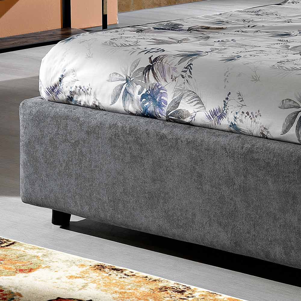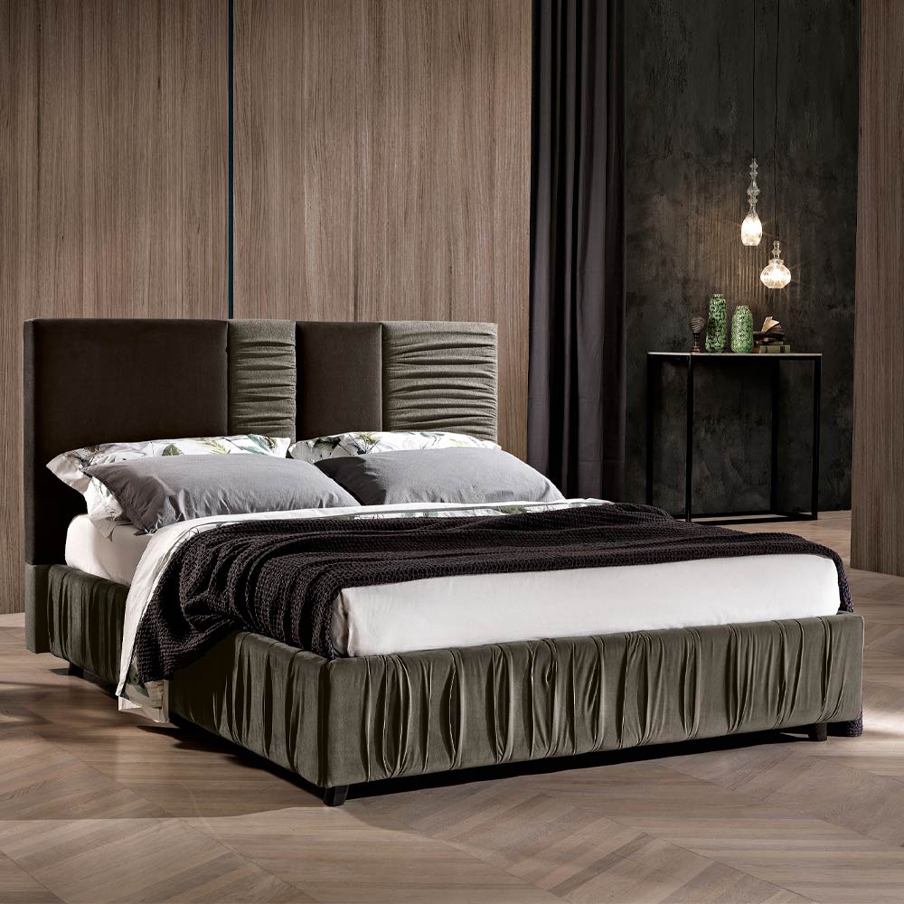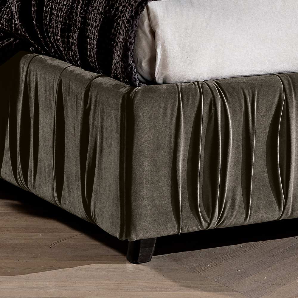In den Versionen Vulkan und Elefant zeigt die moderne Designergänzung die Schönheit des Stoffes mit Falten, der auch auf den Bettrahmen aufgebracht wird.