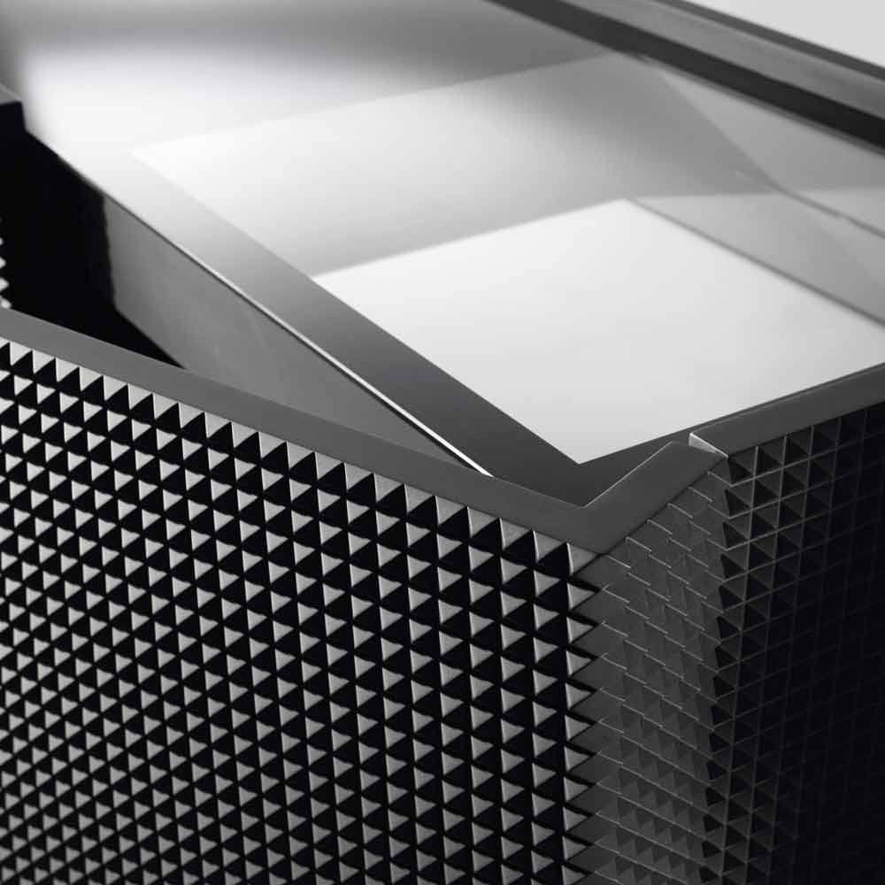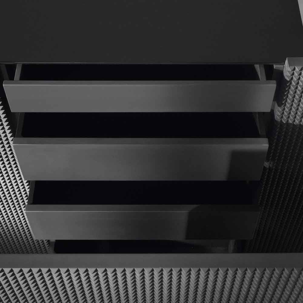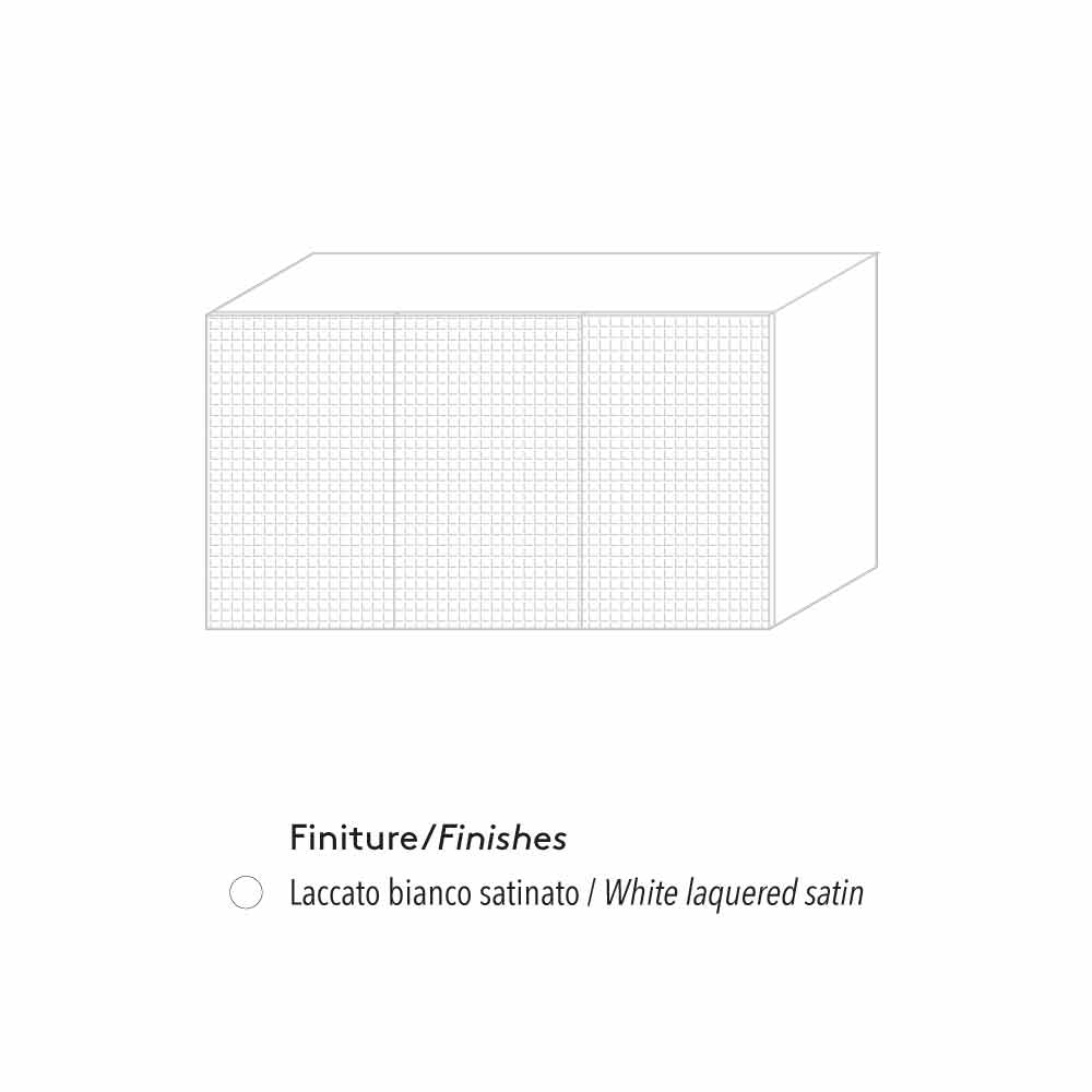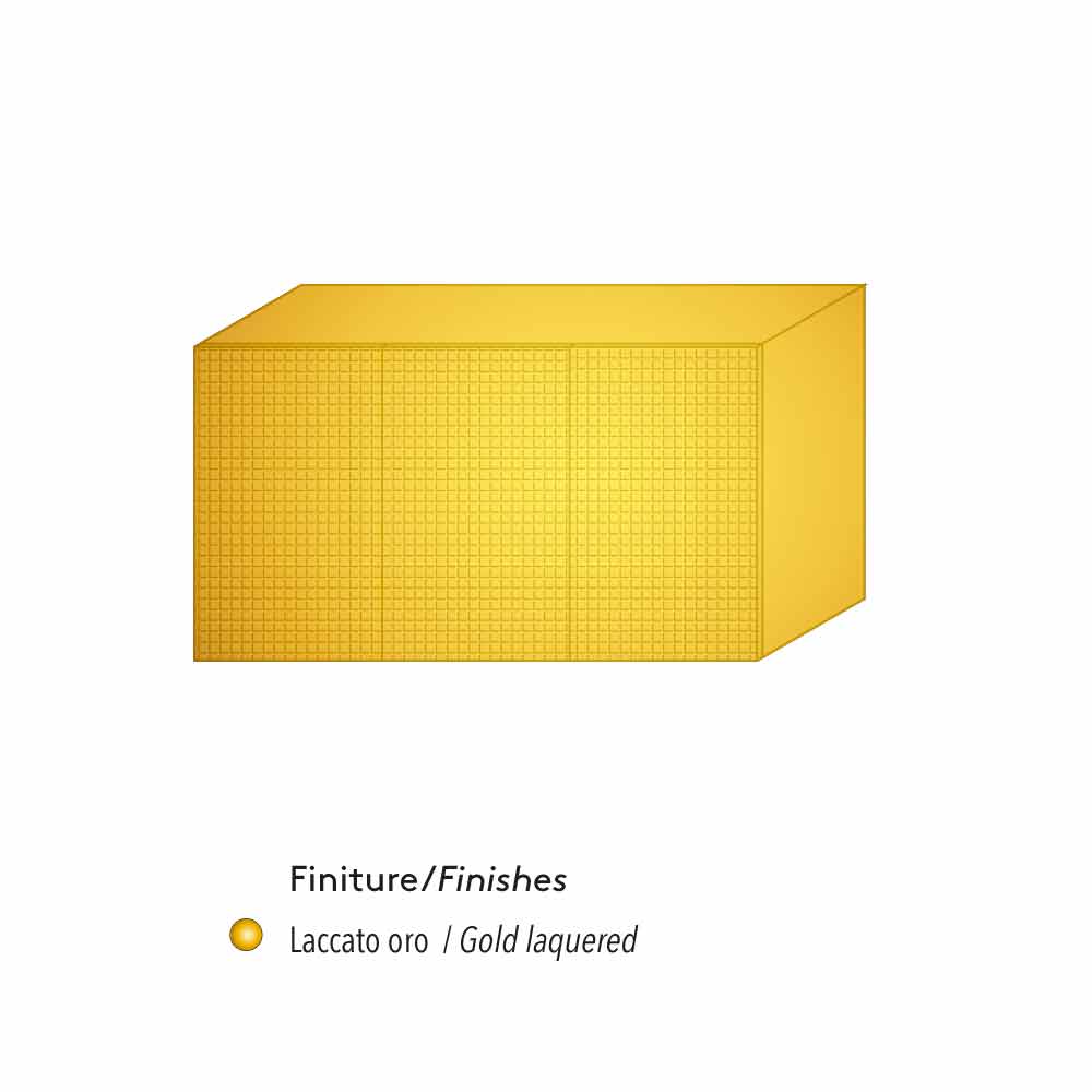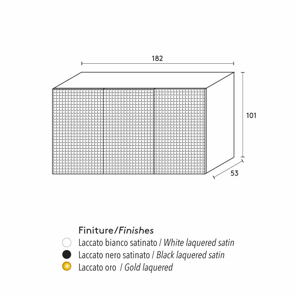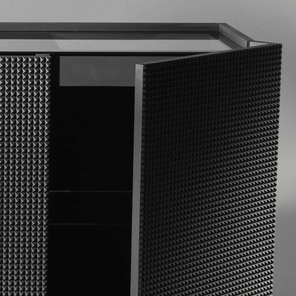 Sideboard mit 2 seitlich öffnenden Schranktüren und 2 internen Schubladen, die schnell und einfach ausgezogen werden können. Die Anrichte besteht aus lackierten MDF Holz, die eine kubische Oberflächenoptik aufweist. Die Anrichte besteht aus 2 Innenregalen und sorgt somit für genügend Stauraum, die Innenregale sowie das obere Ablagefach bestehen aus einseitig lackierten Glas satiniert und ist in den Farben schwarz, weiss oder gold verfügbar.
