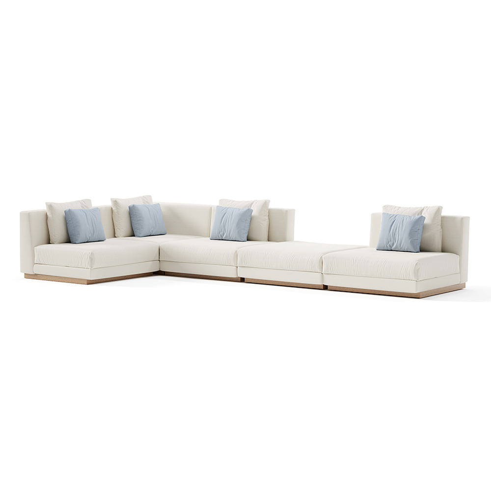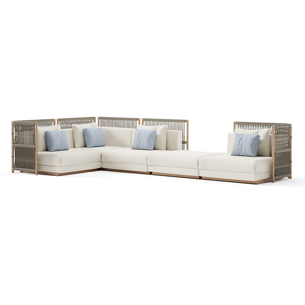 Komplett in Italien hergestelltes modulares Gartensofa mit Sitz- und Rückenkissen aus gepolstertem Stoff. Das Produkt besteht aus einem niedrigen und tiefen Sitz und dank der großen Kissen wird es zu einem einladenden und einladenden System, das eine entspannte und informelle Atmosphäre schaffen soll. Dieses Sofa ist perfekt, um jede Umgebung einzigartig zu machen, und bietet die Freiheit, Ihre Wohnräume mit Geschmack und Stil neu zu gestalten. Dank seiner einfachen und linearen Oberflächen garantiert es Eleganz und Raffinesse für jede Umgebung, in der es platziert wird. Die Variante mit der Struktur aus Iroko-Holz und grünem Seilgeflecht erinnert dank ihrer Dekoration an die handwerkliche Tradition des Webens und verleiht der Komposition einen Hauch von einzigartiger Identität , während sie ein rein dekoratives Element bleibt. Diese Struktur kann auch als freistehende Trennwand verwendet werden.