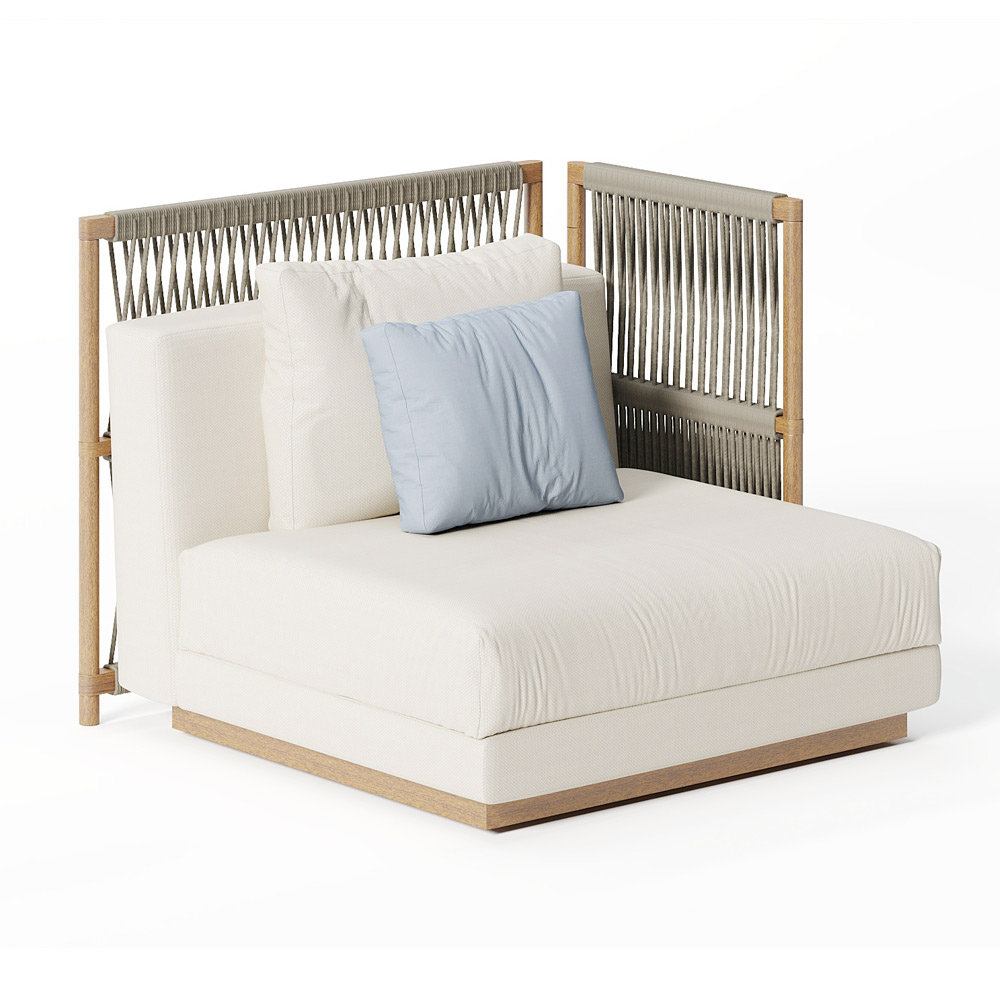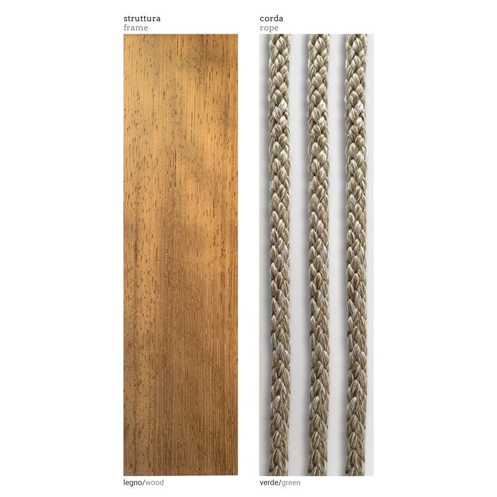 Modulares Gartensofa, vollständig in Italien hergestellt , mit Sitz- und Rückenkissen aus gepolstertem Stoff und Struktur aus Iroko-Holz und grünem Seilgeflecht . Das Produkt besteht aus einem niedrigen und tiefen Sitz und dank der großen Kissen wird es zu einem einladenden und einladenden System, das eine entspannte und informelle Atmosphäre schaffen soll. Dieses Set ist perfekt, um jede Umgebung einzigartig zu machen, indem es die Freiheit bietet, Ihre Wohnräume mit Geschmack und Stil neu zu gestalten. Dank seiner einfachen und linearen Oberflächen garantiert es Eleganz und Raffinesse für jede Umgebung, in der es platziert wird. Die Struktur aus Iroko-Holz erinnert dank ihrer Flechtung und Dekoration an die handwerkliche Tradition des Webens und verleiht der Komposition einen Hauch von einzigartiger Identität , während sie ein rein dekoratives Element bleibt. Diese Struktur kann auch als freistehende Trennwand verwendet werden.