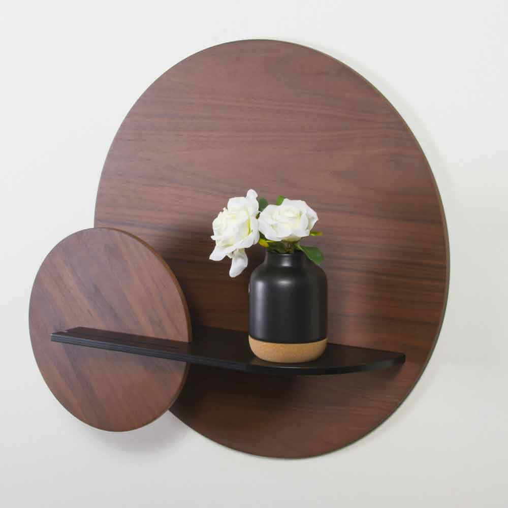 Dieses Regal besteht aus 3 Sperrholzplatten , von denen eine in schwarz gebeizter Esche mit einem Metallträger an der Wand befestigt ist, der als echte Auflagefläche dient, und zwei weiteren vertikal montierten runden Platten in Walnussoptik , die positioniert werden können in 8 verschiedenen Konfigurationen, die es ermöglichen, ein an den Geschmack und die Bedürfnisse anpassbares Produkt zu erhalten. Um die Funktionalität dieses wundervollen Artikel weiter zu erhöhen, gibt es ein praktisches Kabelloch hinter der kleineren vertikale Platte, ideal positionierte , für jede Art von Kabeln oder Ladegerät versteckt. Dieses Designobjekt ist zweifellos eine originelle und innovative Idee, die dank ihres minimalen Stils und der geometrischen Linien in Kombination mit den verwendeten hochwertigen Materialien und Oberflächen ein elegantes und vielseitiges Produkt zum Leben erweckt, das die Atmosphäre jedes Raums revolutionieren kann. mit einem zeitgemäßen Geschmack. Schnell und einfach mit einem einfachen feuchten Tuch zu reinigen.