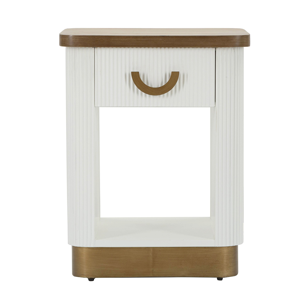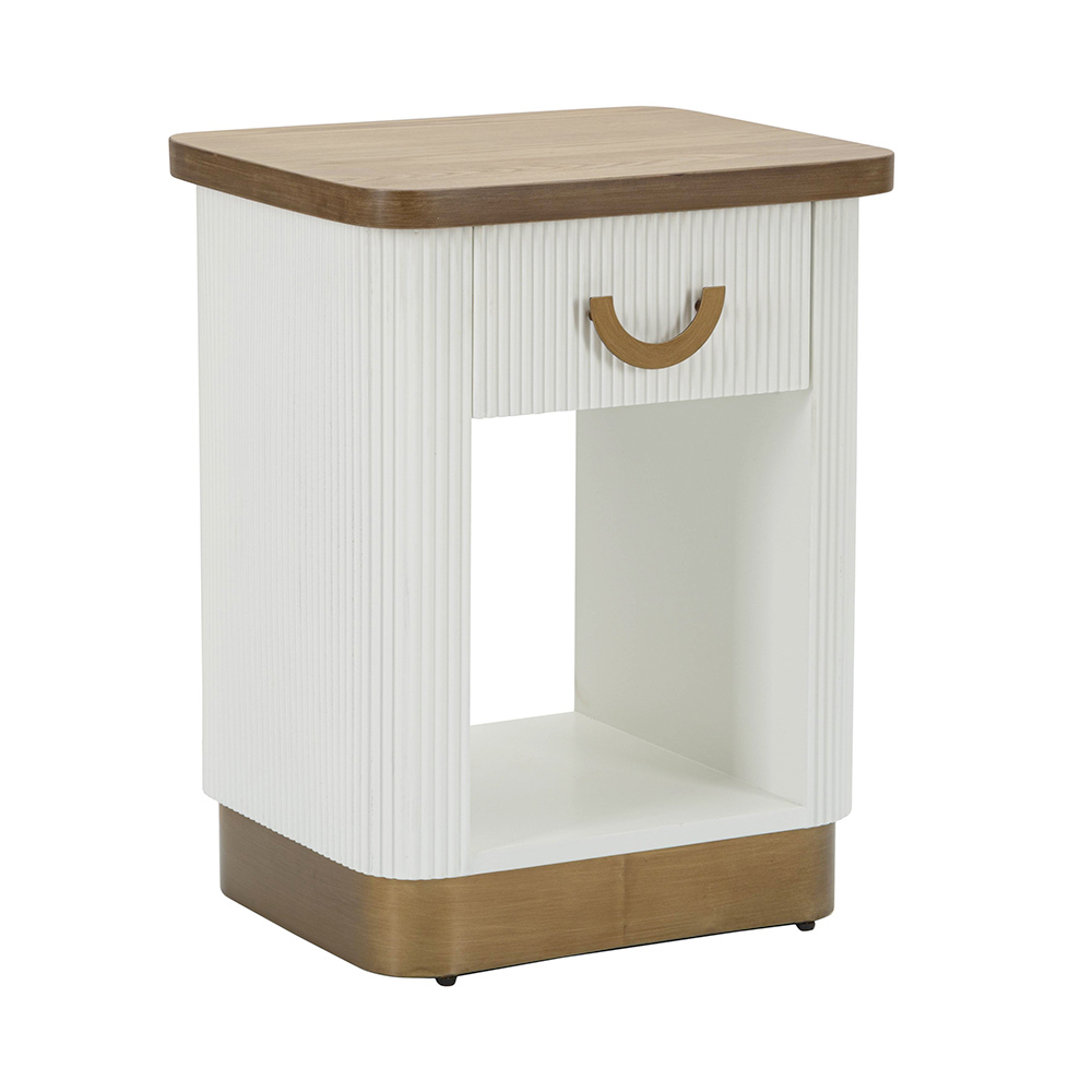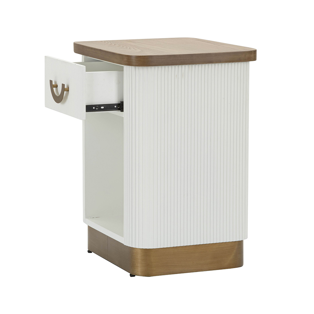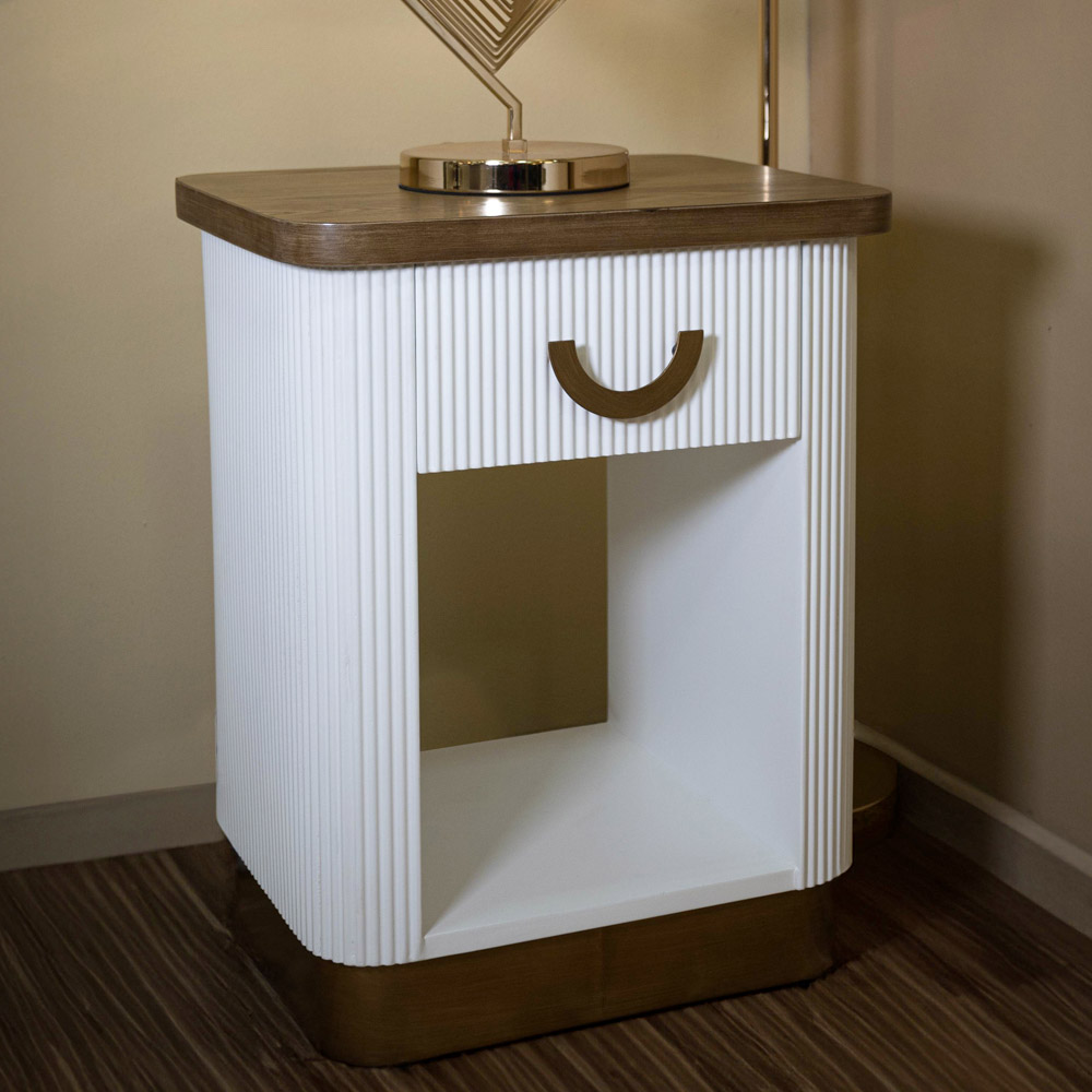 Der geriffelte weiße Sockel des Nachttischs ist ein Statement moderner Eleganz . Seine klaren Linien und die vertikale Struktur verleihen Tiefe und optische Spannung. Das Detail des Griffs harmoniert perfekt mit dem Sockel und verleiht ihm einen Vintage- und doch modernen Look.
