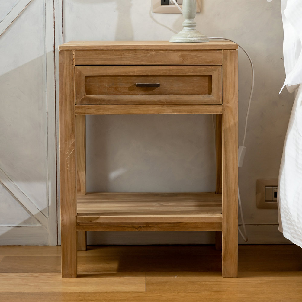 Dieser Nachttisch aus massivem Teakholz ist ein schlichtes und funktionales Möbelstück, ideal fürs Schlafzimmer oder als Sideboard in anderen Räumen. Die handwerkliche Verarbeitung und die natürliche Holzmaserung verleihen ihm eine warme und authentische Ausstrahlung – perfekt für einen zeitlosen Stil.