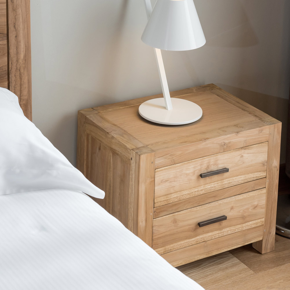 Dieser Nachttisch aus massivem Teakholz ist ein kompaktes und elegantes Möbelstück, das Ihrem Schlafzimmer einen natürlichen und zeitlosen Stil verleiht. Die handwerkliche Verarbeitung und die natürliche Holzmaserung verleihen ihm eine warme und authentische Ausstrahlung.