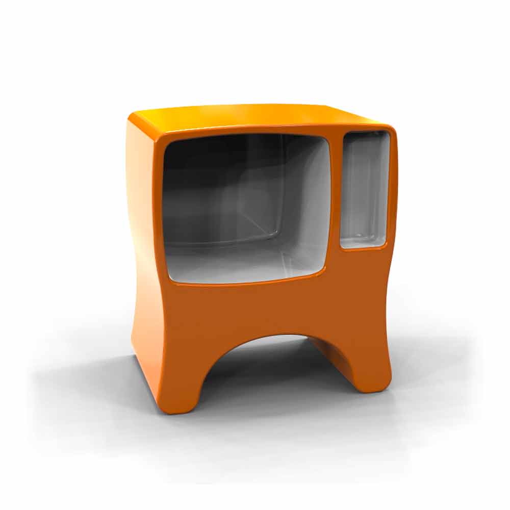 Catodico ist eine Aufbewahrungseinheit oder bei Bedarf ein kleiner Nachttisch. Es erinnert an alte CRT-Fernseher. Die Idee ist, es auszuschalten, es zu leeren und hineinzulegen, was jeder will.