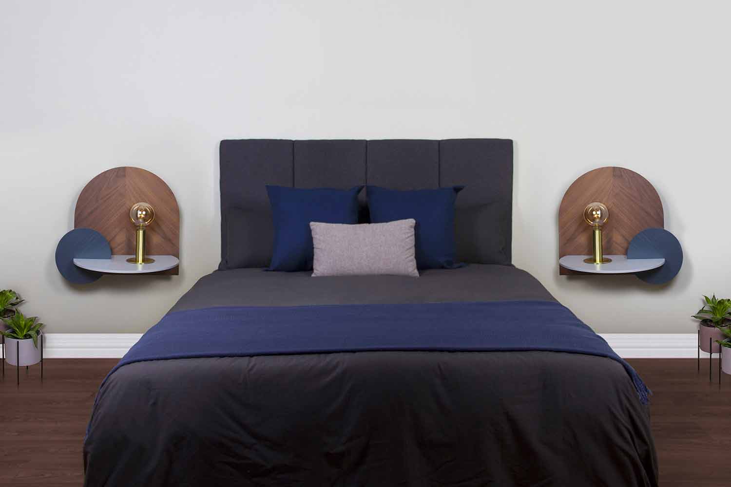 Der Nachttisch ist eines der wichtigsten Elemente in jedem Schlafzimmer und es ist notwendig, dass die Struktur Funktionalität und einen dekorativen und gestalterischen Aspekt kombiniert. Dieser modulare Nachttisch stellt eine innovative und originelle Idee dar, die dank ihres einzigartigen Stils und der Kombination von Materialien und Oberflächen, die Eleganz und ein äußerst modernes Design verleihen, jede Aufmerksamkeit im Raum auf sich ziehen kann. Die Struktur besteht aus 3 Sperrholzplatten , eine in Walnussholz und zwei in blau und grau lackierter Esche . Das Paneel, das als echte Auflagefläche fungiert, ist an der Wand befestigt und die 2 modularen Paneele sind darauf montiert, die in 8 verschiedenen Konfigurationen positioniert werden können. So erhalten Sie ein Produkt, das an die Bedürfnisse und Räume angepasst werden kann. Die Struktur hat auch ein Kabelloch hinter der Frontplatte, so dass sie versteckt werden können und der Nachttisch noch funktionaler und praktischer wird. Zwischen den vertikalen Paneelen und der Wand befindet sich ein 9-cm-Fach, in dem Bücher und Zeitschriften oder andere Gegenstände aufbewahrt und organisiert werden können, um den verfügbaren Platz optimal zu nutzen. Schnell und einfach mit einem einfachen feuchten Tuch zu reinigen.