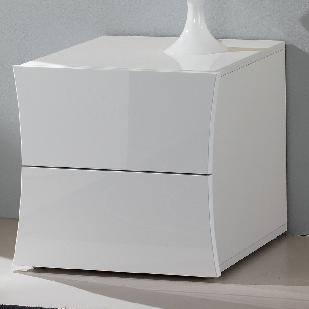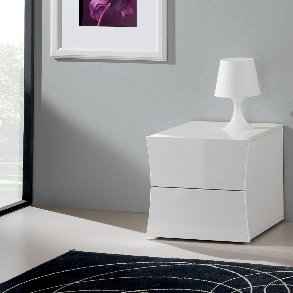 Der Nachttisch mit 2 Schubladen zeichnet sich durch sein bogenförmiges Design mit weichen und geschwungenen Linien aus, mit einer attraktiven und interessanten Optik. Im Schlafzimmer platziert, zieht die glänzende Front die Aufmerksamkeit auf sich und sorgt für einen schicken und eleganten Effekt.