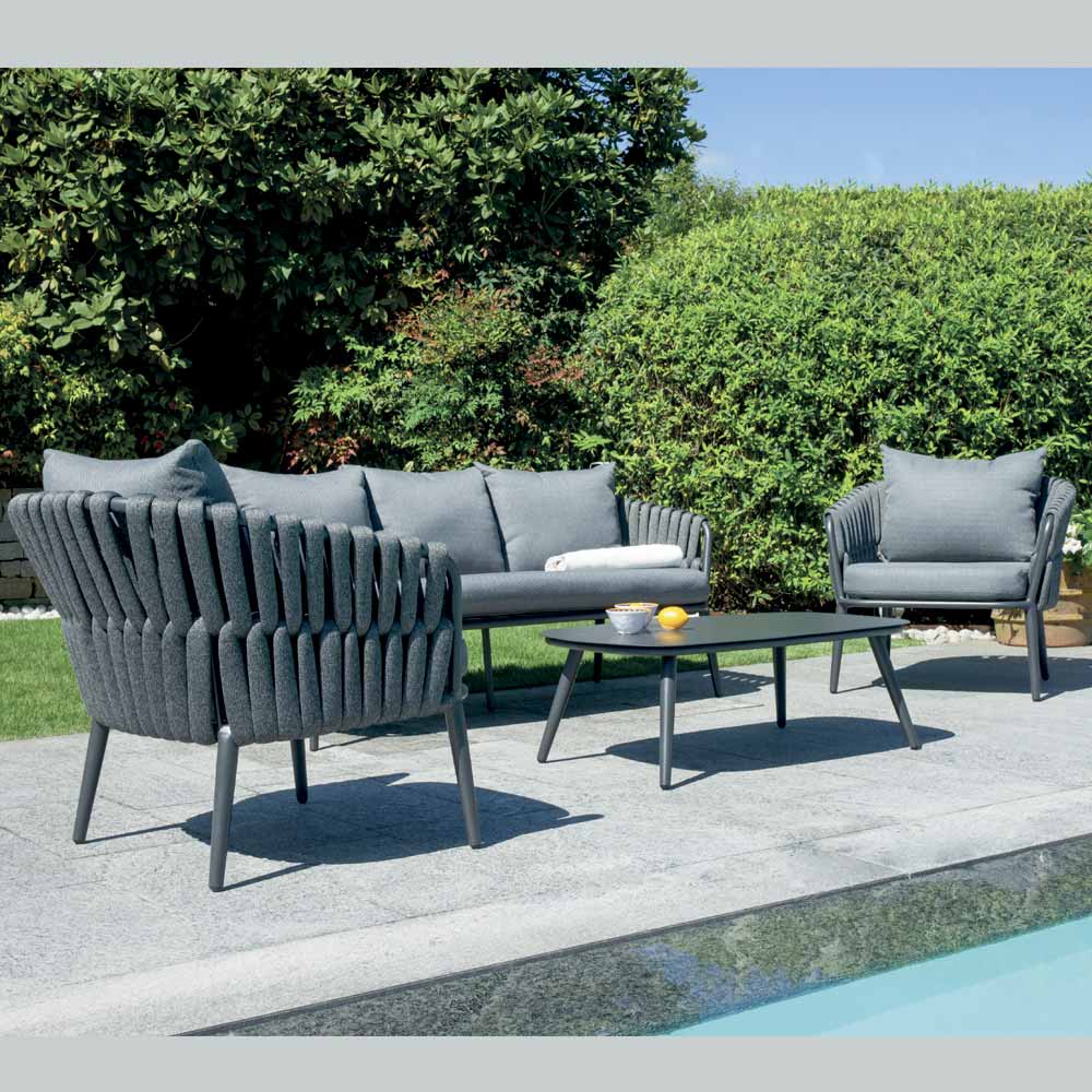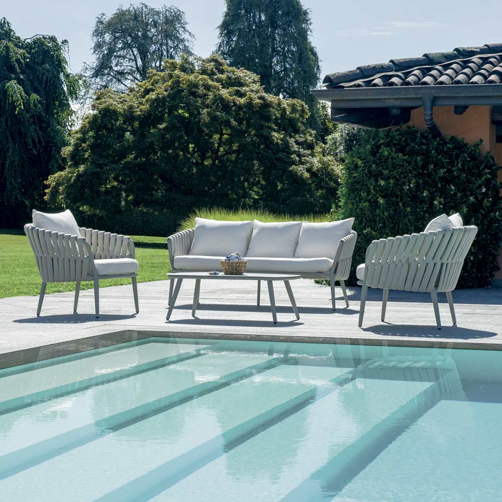 Ideal für alle, die ein elegantes, komfortables und langlebiges Outdoor-Wohnzimmer suchen, das Ästhetik und Funktionalität in einer einzigen Designlösung vereint.