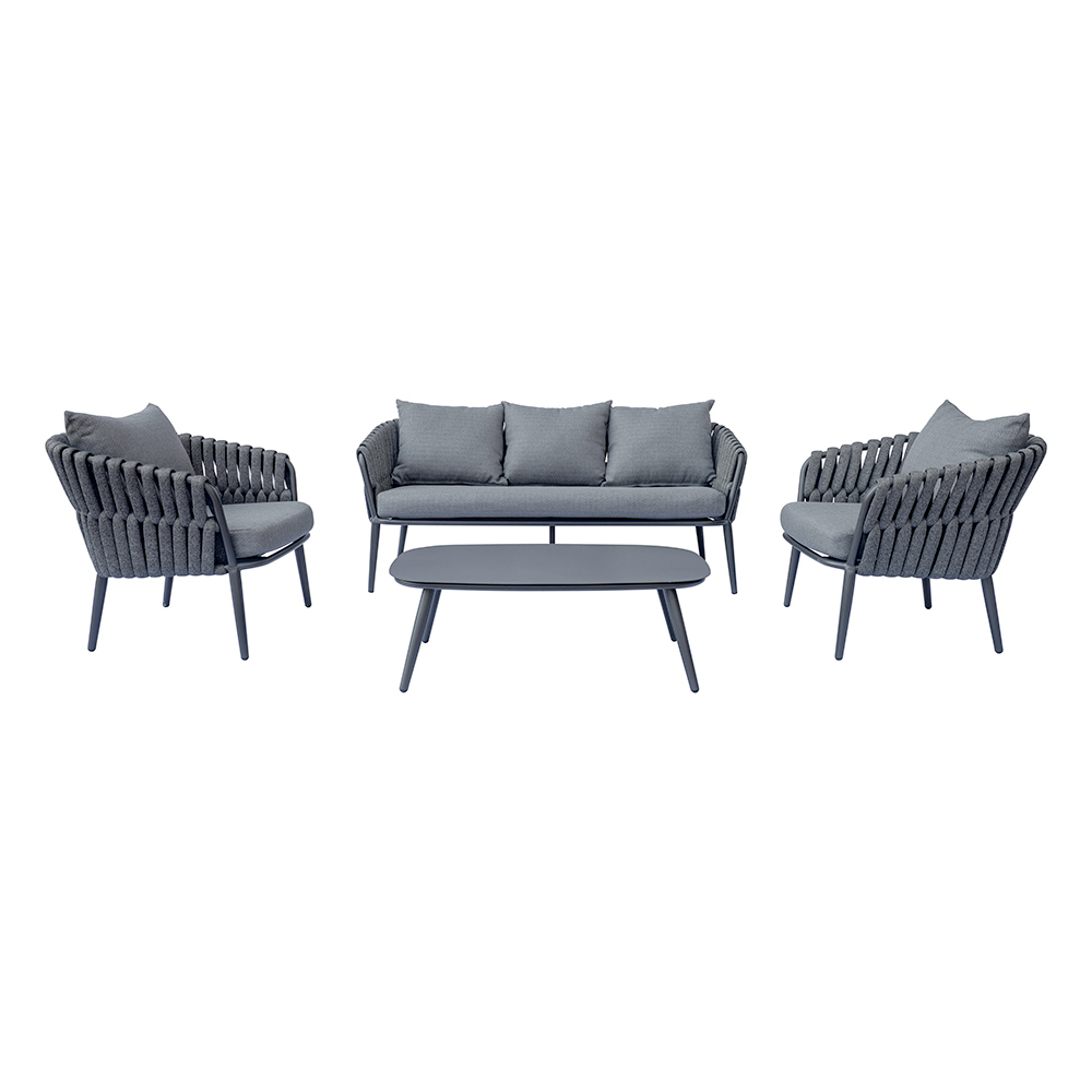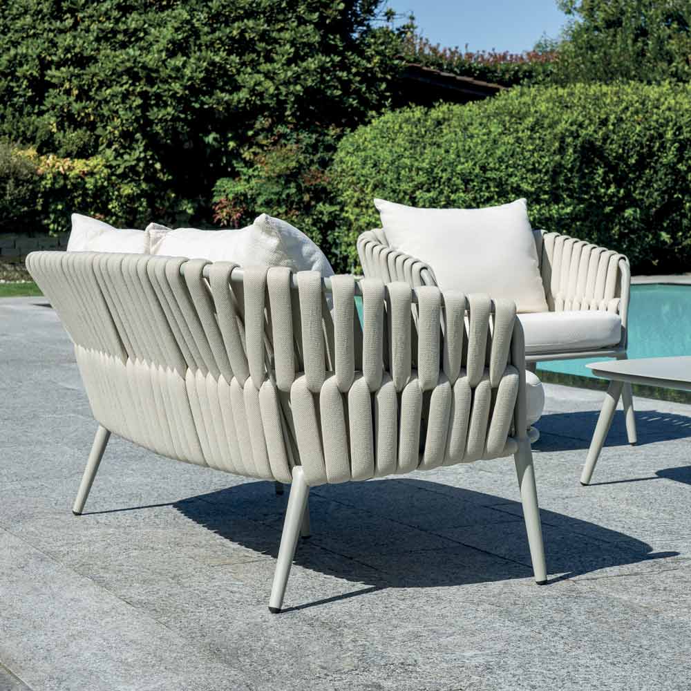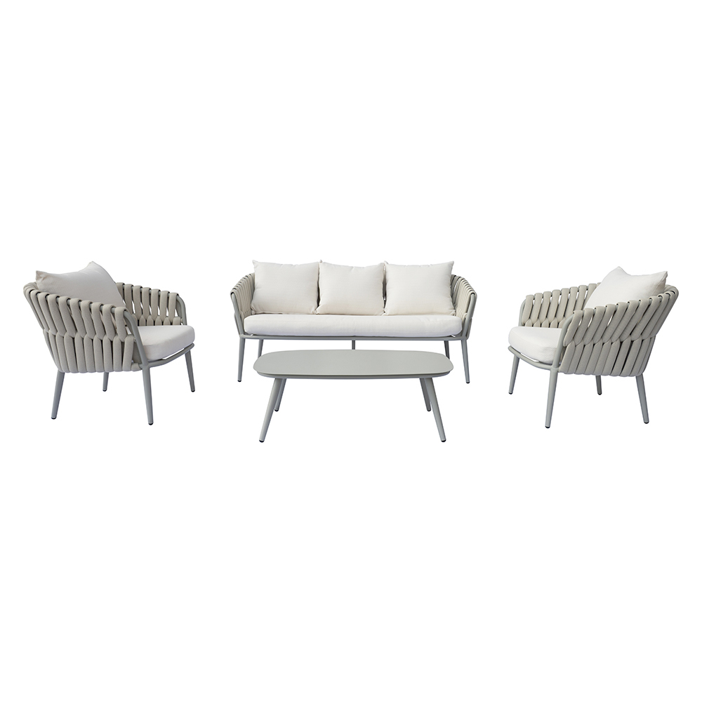 Das Aluminiumgestell sorgt für Leichtigkeit und Langlebigkeit, während gepolsterte Seile Sitzflächen und Rückenlehnen umhüllen und so für eine moderne und zugleich komfortable Note sorgen. Die abnehmbaren Kissenbezüge gewährleisten Praktikabilität und einfache Reinigung und erhalten so dauerhaft das elegante und edle Erscheinungsbild des Wohnzimmers.