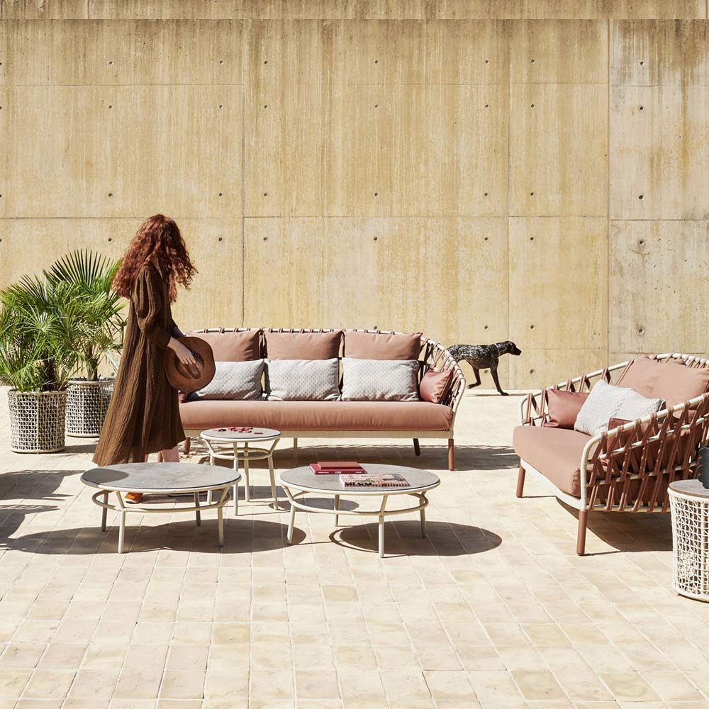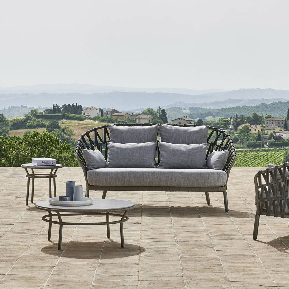Runder Couchtisch für den Außenbereich, hergestellt in Italien , mit Struktur aus epoxidpulverbeschichtetem Aluminium , Seilgeflecht aus synthetischen Fasern und Platte aus HPL- oder gehämmerter Keramik. Dank seines geradlinigen, sauberen und funktionalen Designs eignet sich dieser Couchtisch perfekt für die Einrichtung von Außenbereichen wie Terrassen, Schwimmbädern und Gärten, findet aber auch seinen Platz in den verschiedenen Wohnbereichen im Innenbereich.