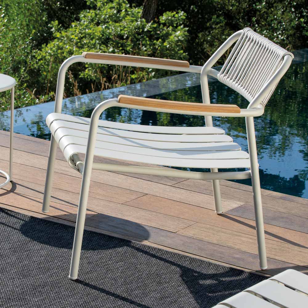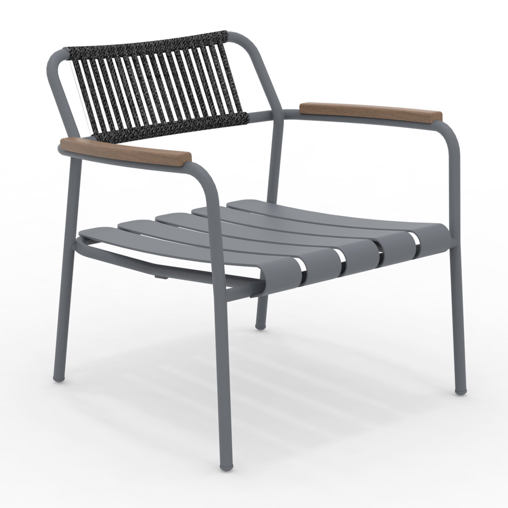 Die leichte, aber robuste Struktur bietet höchsten Komfort. Der ergonomische Sitz und die geformte Rückenlehne aus Seil sorgen für bequemen und entspannenden Halt. Die Aluminiumlamellen verleihen einen dynamischen und modernen Look, während das Finish einen Hauch von Eleganz und Raffinesse verleiht.