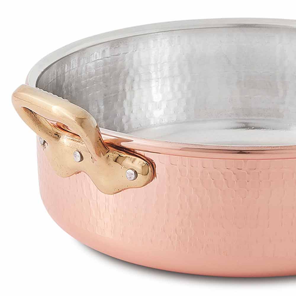 Niedrige Kasserolle aus handgehämmertem Kupfer mit Messinggriffen, rundes Design 28 cm made in Italy.