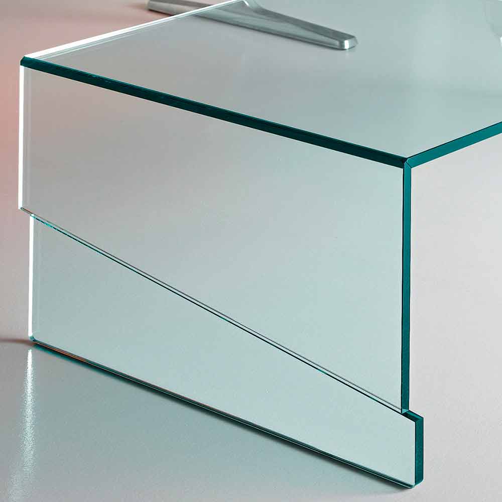 Es ist vollständig aus transparentem Glas gefertigt und zeichnet sich durch die freitragenden geschnittenen und geschweißten Seiten- und Auflageflächen aus, die mit einer Technologie hergestellt werden, die im Dienste des Designs steht.