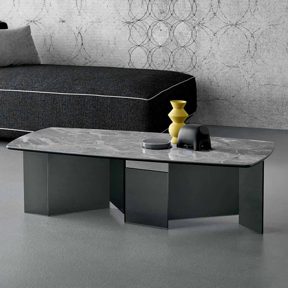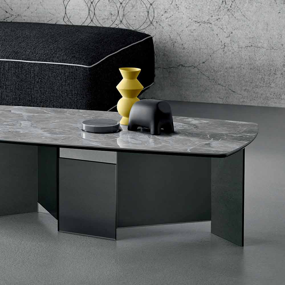 Hergestellt aus Rauchglas für den Sockel und einer glänzenden orobischen grauen Keramikplatte , ist es ein in Italien handgefertigtes Möbelstück mit hochwertigen Materialien, ideal für den Wohnbereich.