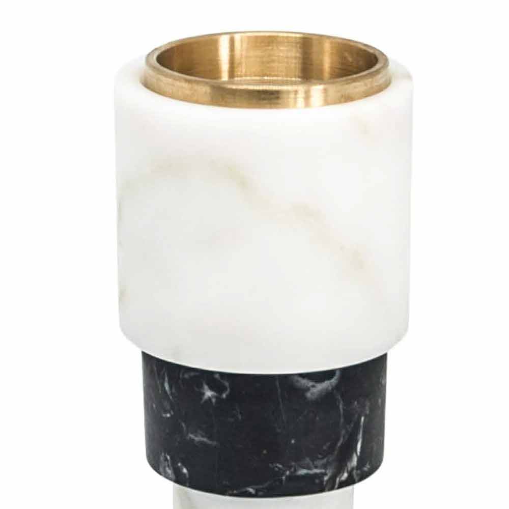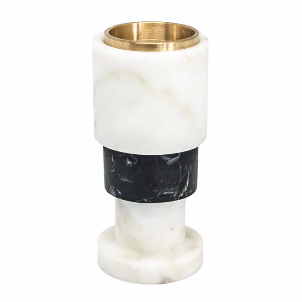 ZweifarbigerKerzenhalter aus hochwertigemMarmor und Messing . Es ist als Unikat zu betrachten, da sich jeder verwendete Marmorblock von den anderen für Adern und Schattierungen unterscheidet. Der weiße Marmor stammt aus dem Steinbruch Poggio Silvestre, einer Quelle von Marmor erster Qualität, der seit dem letzten Jahrhundert klassifiziert wurde, während der schwarze Marquinia-Marmor aus spanischen Steinbrüchen gewonnen wird.