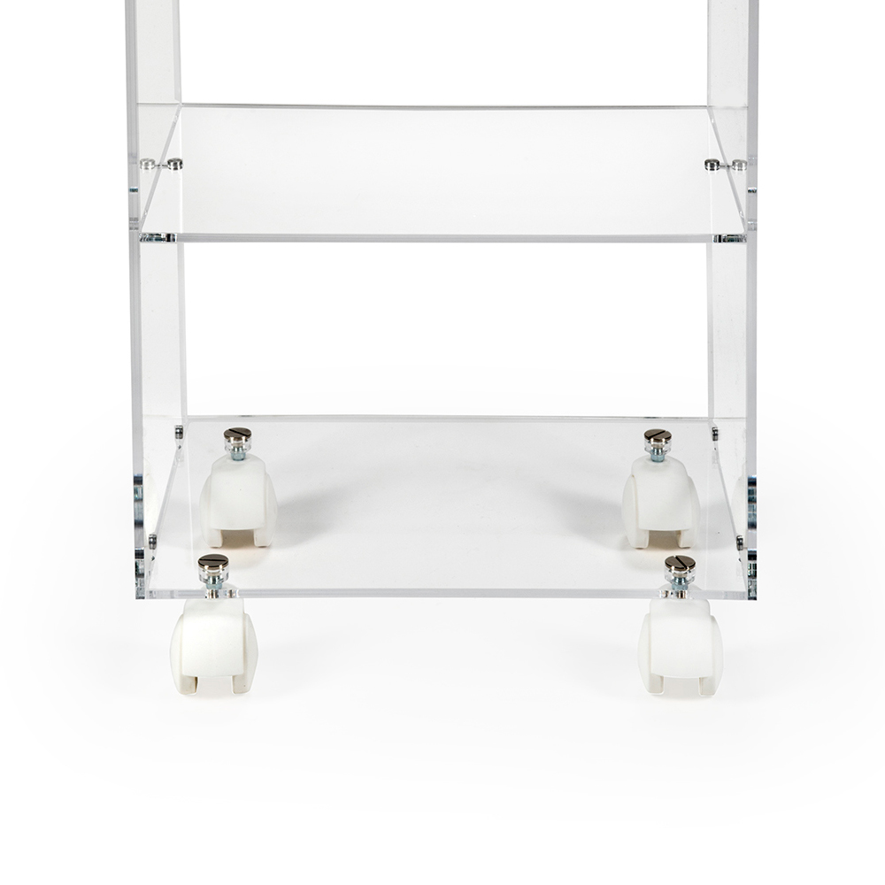 Jedes Regal dieses Wagens ist eine Bühne, die dank der kristallinen Transparenz des erstklassigen Plexiglases den darin enthaltenen Inhalt aufwertet. Der Rohstoff, 100 % reines Polymer-Plexiglas , sorgt für eine Helligkeit und Brillanz, die über die Zeit unverändert bleiben, ein sichtbares und spürbares Bekenntnis zur Qualität.