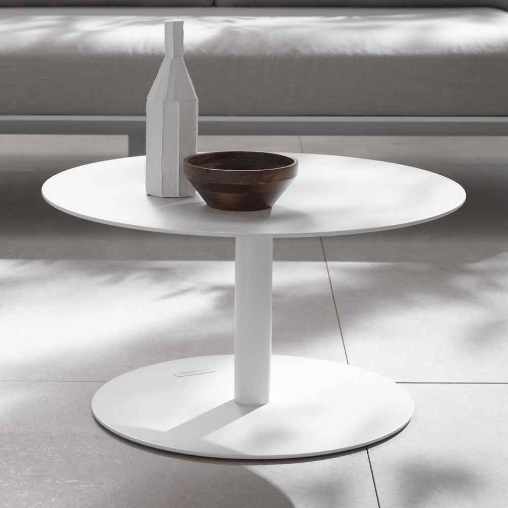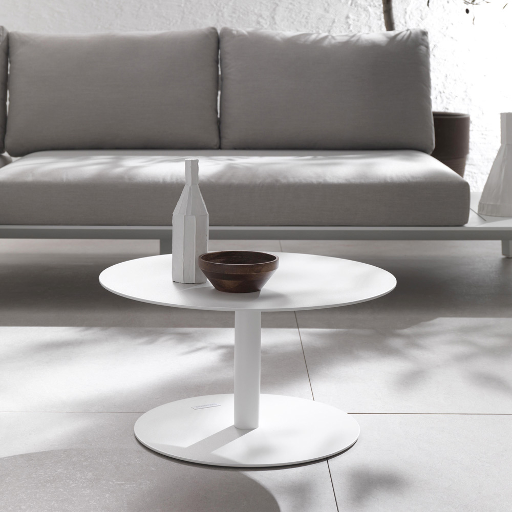 Beistelltisch für den Garten , bestehend aus einer Platte und einer Struktur aus Aluminium , das mit weißen Epoxidpulvern lackiert ist .Dieser Couchtisch, der sich durch ein weiches, lineares und schlichtes Design auszeichnet, eignet sich perfekt für die Einrichtung von Außenbereichen wie Terrassen, Schwimmbädern und Gärten und findet gleichzeitig seinen Platz in den verschiedenen Wohnbereichen im Innenbereich als funktionaler Stützpunkt.