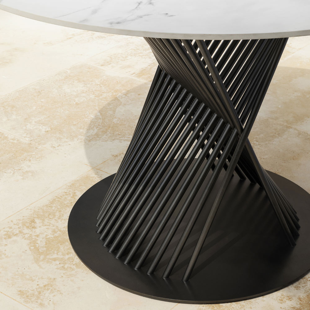 Der Outdoor-Esstisch wird in Italien hergestellt und besteht aus einer Struktur aus Aluminiumguss und einer runden Platte aus Feinsteinzeug mit Marmoroptik . Der Sockel stellt das originellste Detail dar, das diesem Tisch einen starken modernen Charakter und ein raffiniertes und formelles Design verleiht.