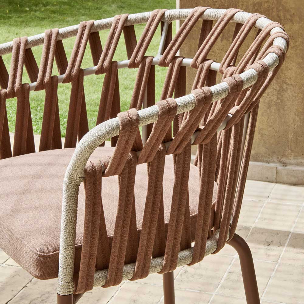 Gartenhocker mitAluminiumstruktur mit Epoxidpulver in Rost-Finish lackiert , Sitz aus rostfarbenem, abnehmbarem Stoff und Rückenlehne ausAluminium , angereichert mit einer Verflechtung vonAcryl-Gewebeschnüren in Rost-Finish, vollständig in Italien hergestellt . Eine innovative und frische Einrichtungslösung, die dank ihrer eleganten und modernen Ästhetik ideal ist, um das Auge zu erfreuen und gleichzeitig einen einladenden und besonders bequemen Sitz zu bieten .