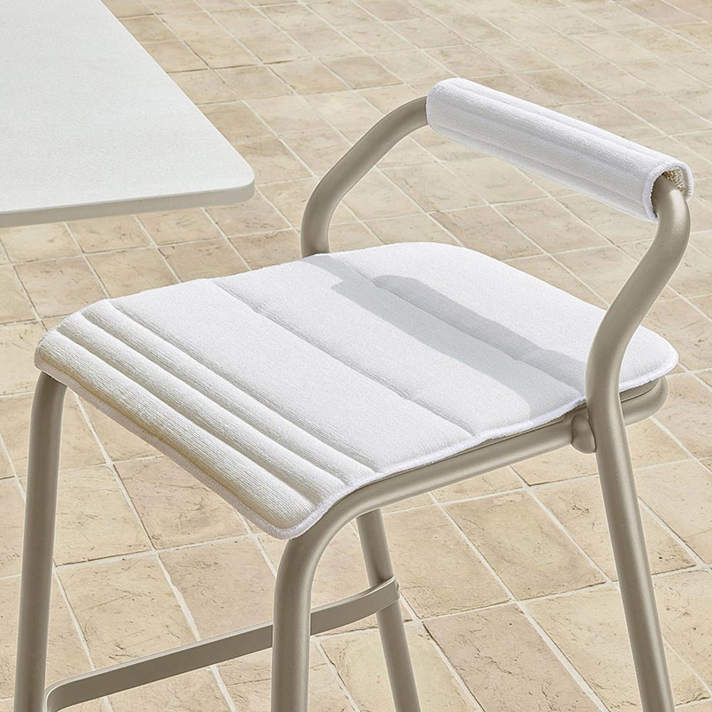 Vollständig in Italien hergestellterHocker für den Außenbereich mit Struktur aus epoxidpulverbeschichtetem Aluminiumrohr in Seidengrau und Sitz komplett mit weißen Sitz- und Rückenkissen, die mit Dryfeel-Gummi gepolstert sind. Dieses moderne Möbelstück wurde entwickelt, um optimalen Komfort zu bieten und dank seiner eleganten Ästhetik dazu beizutragen, die Außenumgebung zu vervollständigen.