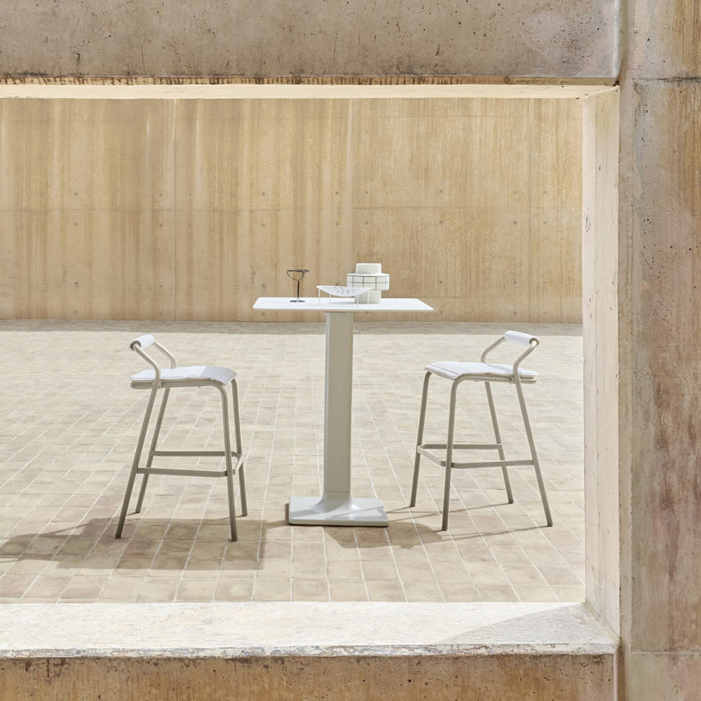 Die Struktur besteht aus lackiertem Aluminium, ein Verfahren, das diesen Hocker solide, widerstandsfähig und einfach zu handhaben macht und daher ideal für den Einsatz im Außenbereich geeignet ist. Eine innovative und frische Einrichtungslösung, bereichert durch die wunderbaren vorgeschlagenen Oberflächen, die jeden Außenbereich mit Raffinesse und Persönlichkeit verwandeln.