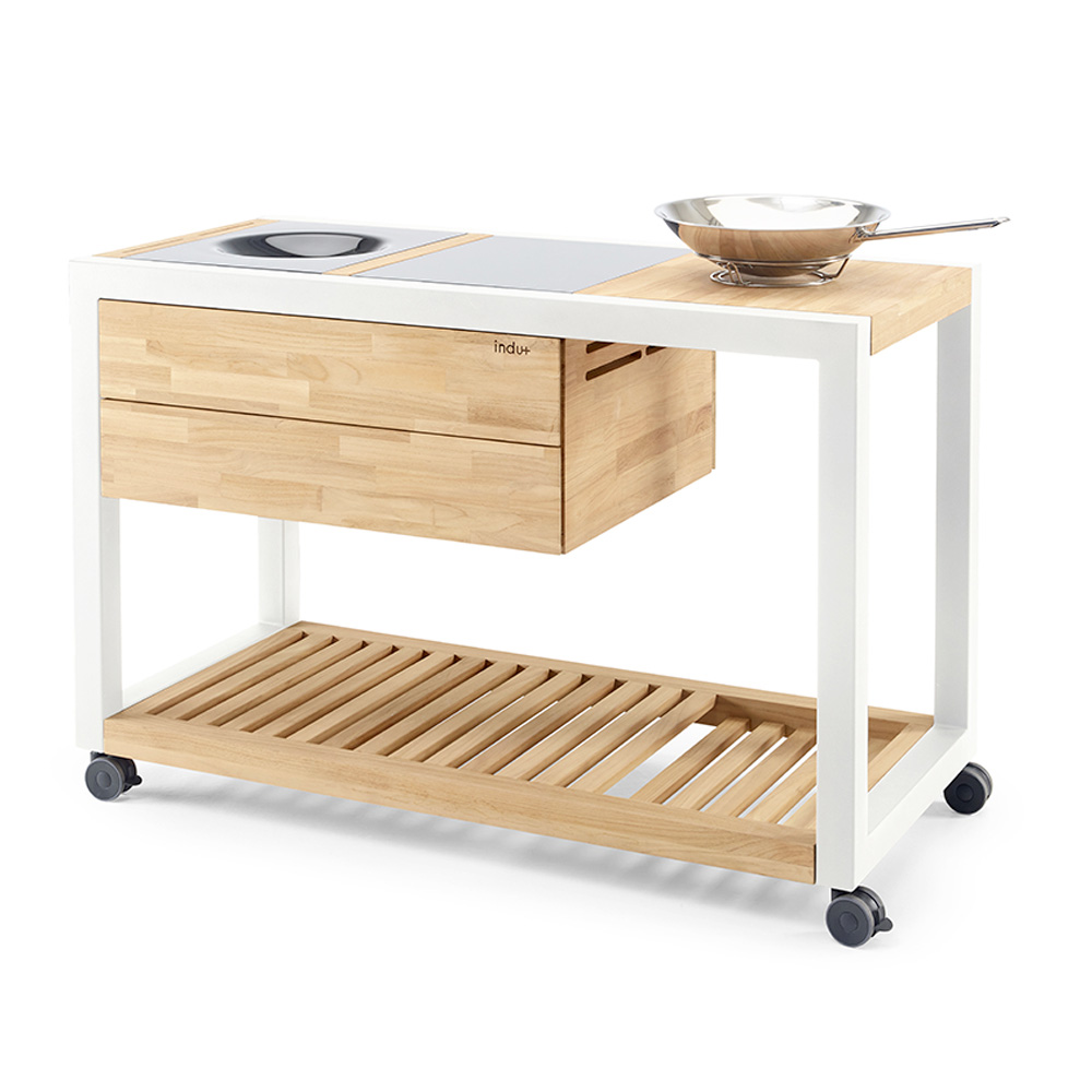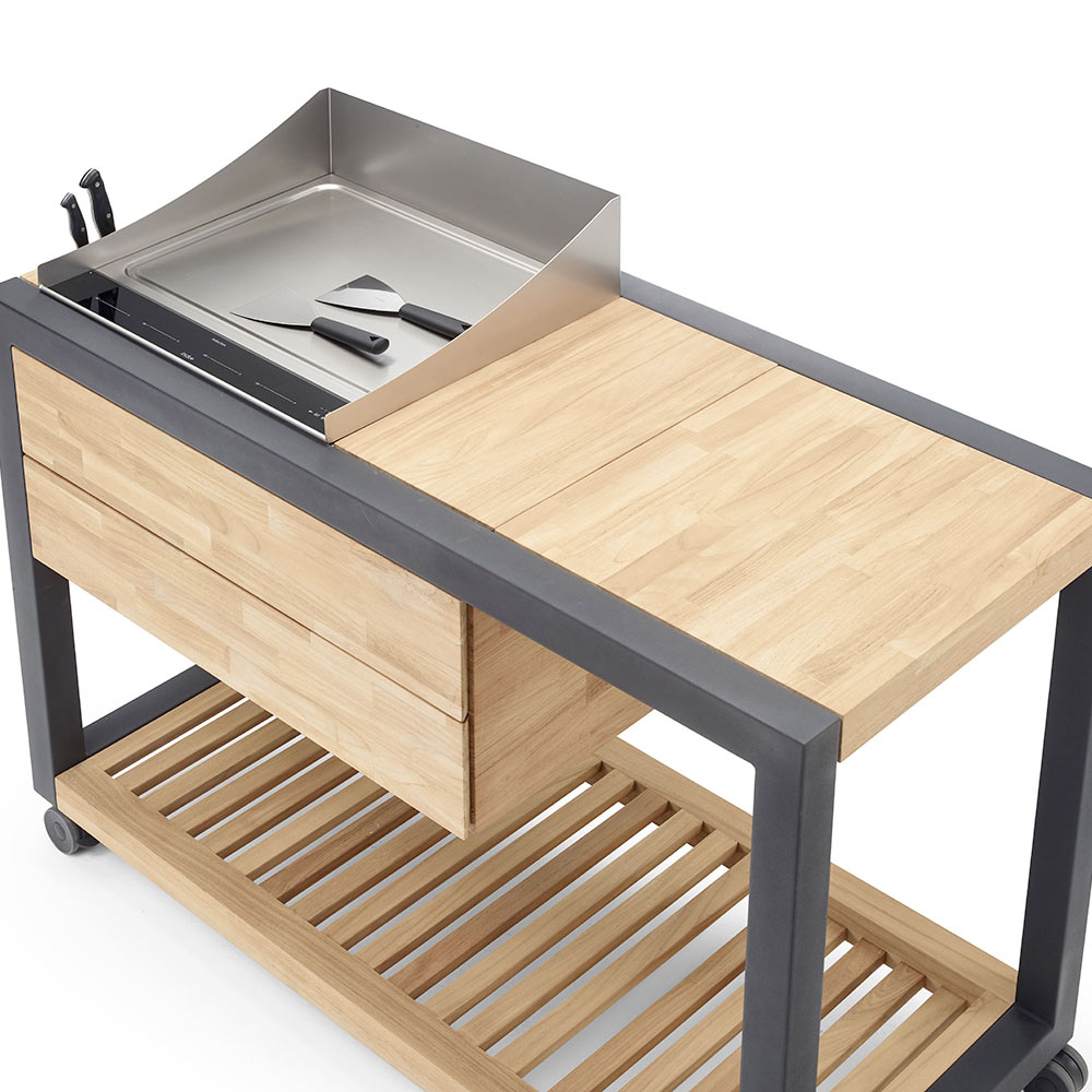 Diese Outdoorküche stellt die perfekte Mischung aus Funktionalität und zeitgenössischem Design dar, ideal um jeden Moment im Freien zu einem einzigartigen Erlebnis zu machen. Der pulverbeschichtete Aluminiumrahmen bietet Robustheit und Witterungsbeständigkeit, während die hochwertigen massiven Teak-Einsätze, die mit Rubio Monocoat Hybrid Wood Protector behandelt wurden, einen Hauch von natürlicher Eleganz und visueller Wärme verleihen.
