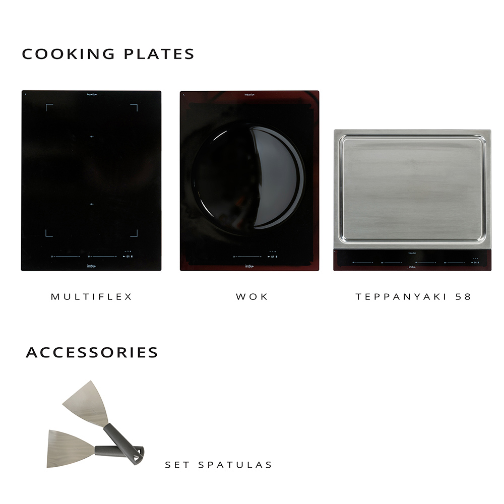TEPPANYAKI 38/58: Modernste Induktionstechnologie - Lock-Touch - Stop & Go Funktion - 2 unabhängige thermostatisch geregelte Kochzonen (vorne und hinten) - je 1400 W - Touch-Schieberegler mit direktem Zugriff auf jede der 10 Heizstufen: 0-9 / Reinigungsstufe - dynamische Temperaturanzeige für beide Kochzonen - Reinigungstasten für jede Zone