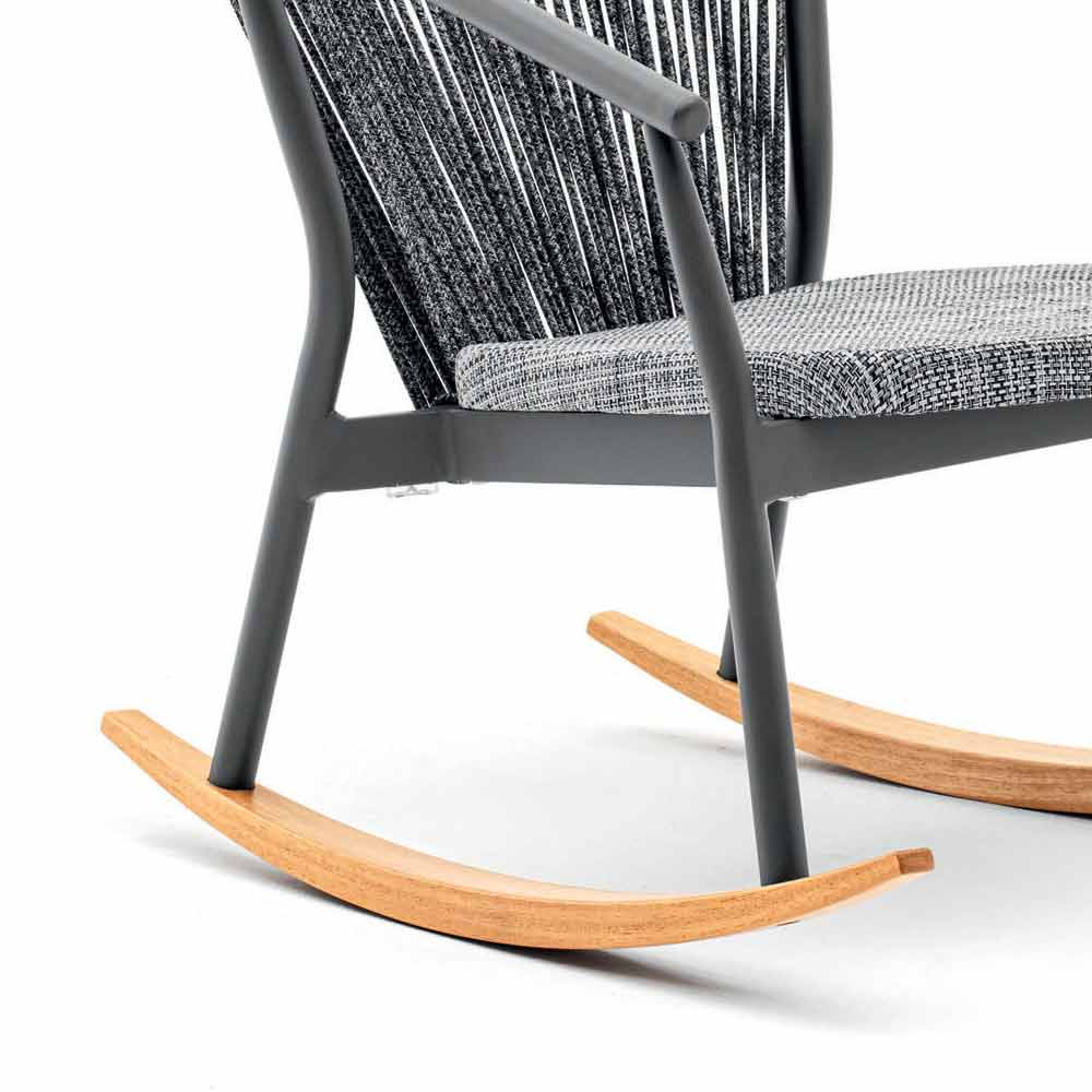 Schaukelsessel im modernen Design für den Außenbereich mit Massivholzbasis und Sitz aus weißem oder aschefarbenem technischen Stoff.