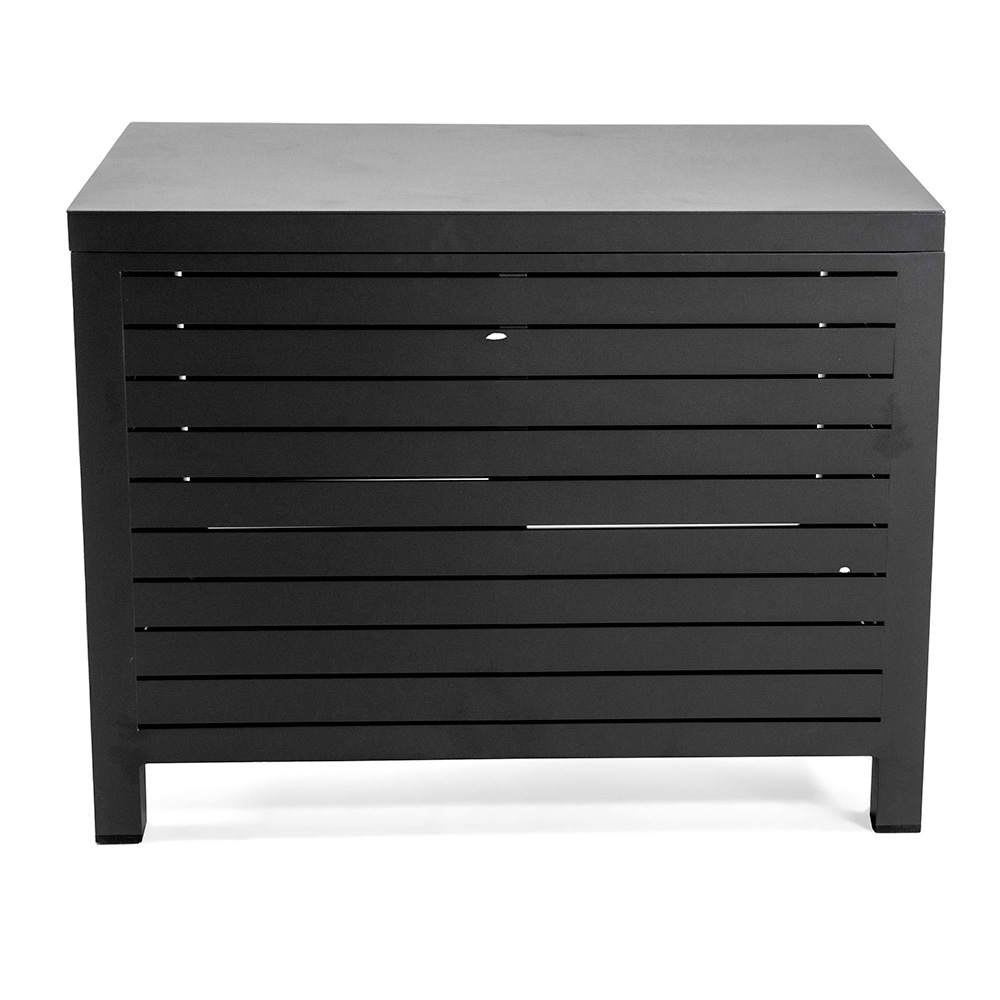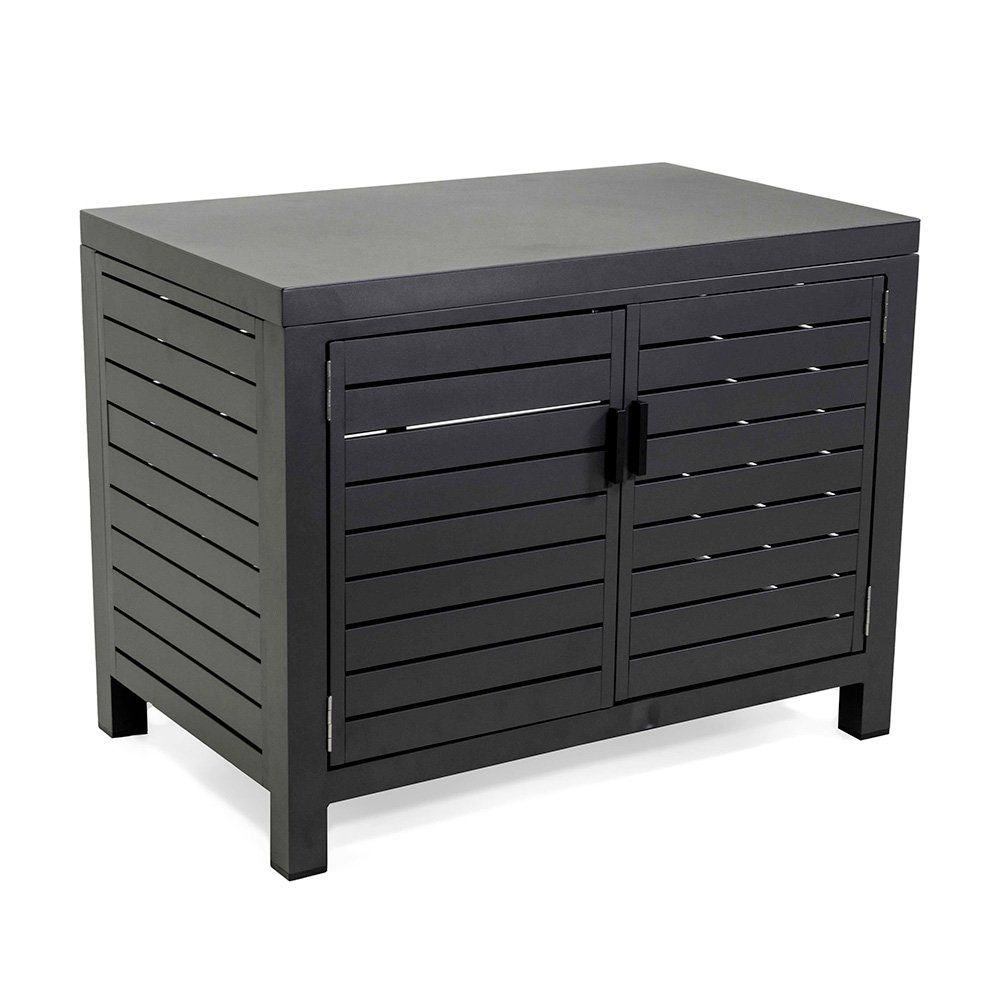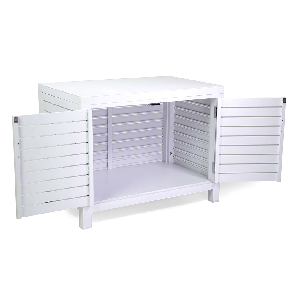 Verleihen Sie Ihrem Außenbereich einen Hauch von moderner Eleganz mit diesem raffinierten Aluminiumschrank, der sich perfekt in jede Außenumgebung einfügt. Das saubere Latten-Design erzeugt einen optisch ansprechenden Effekt und macht ihn zu einem funktionalen und dekorativen Mittelpunkt.