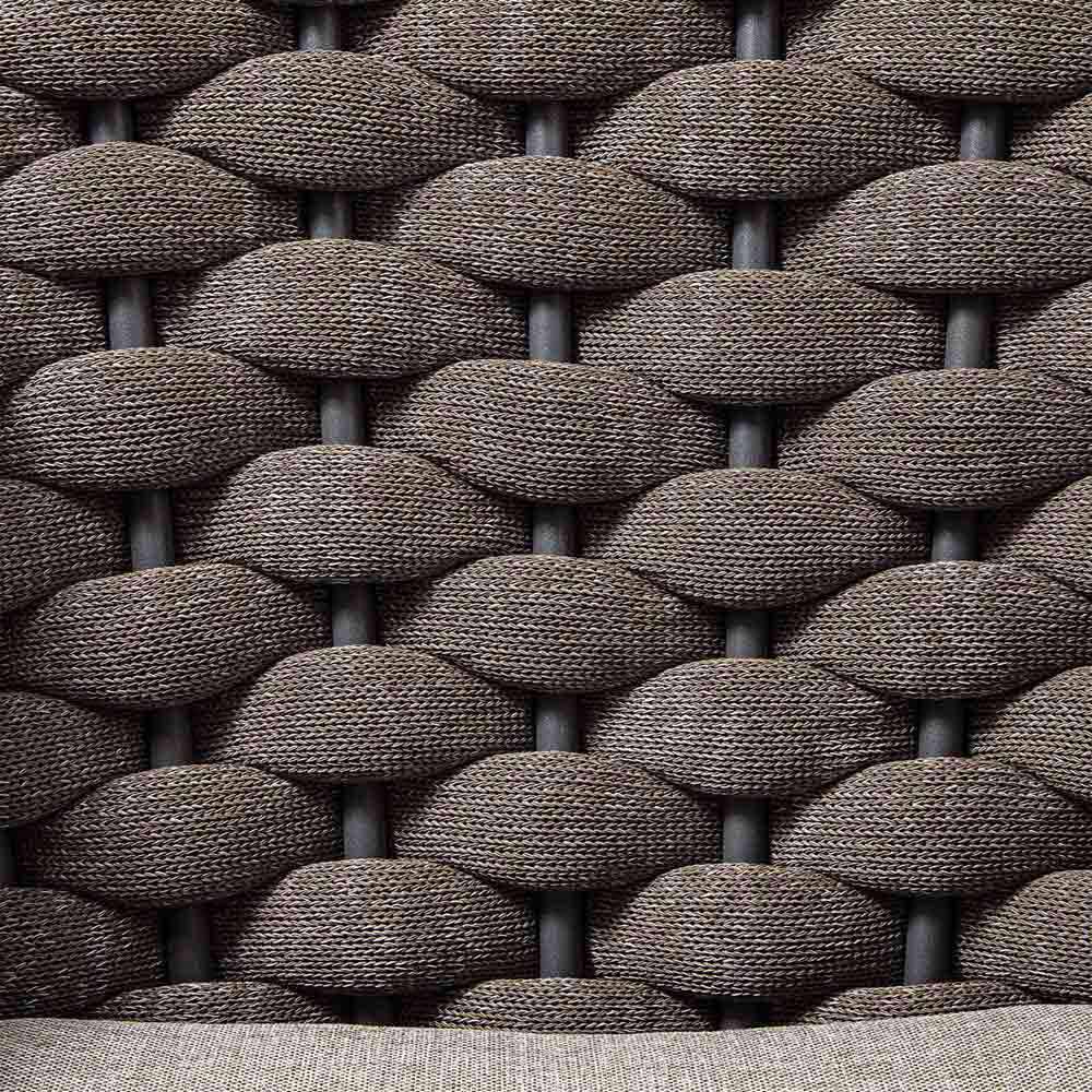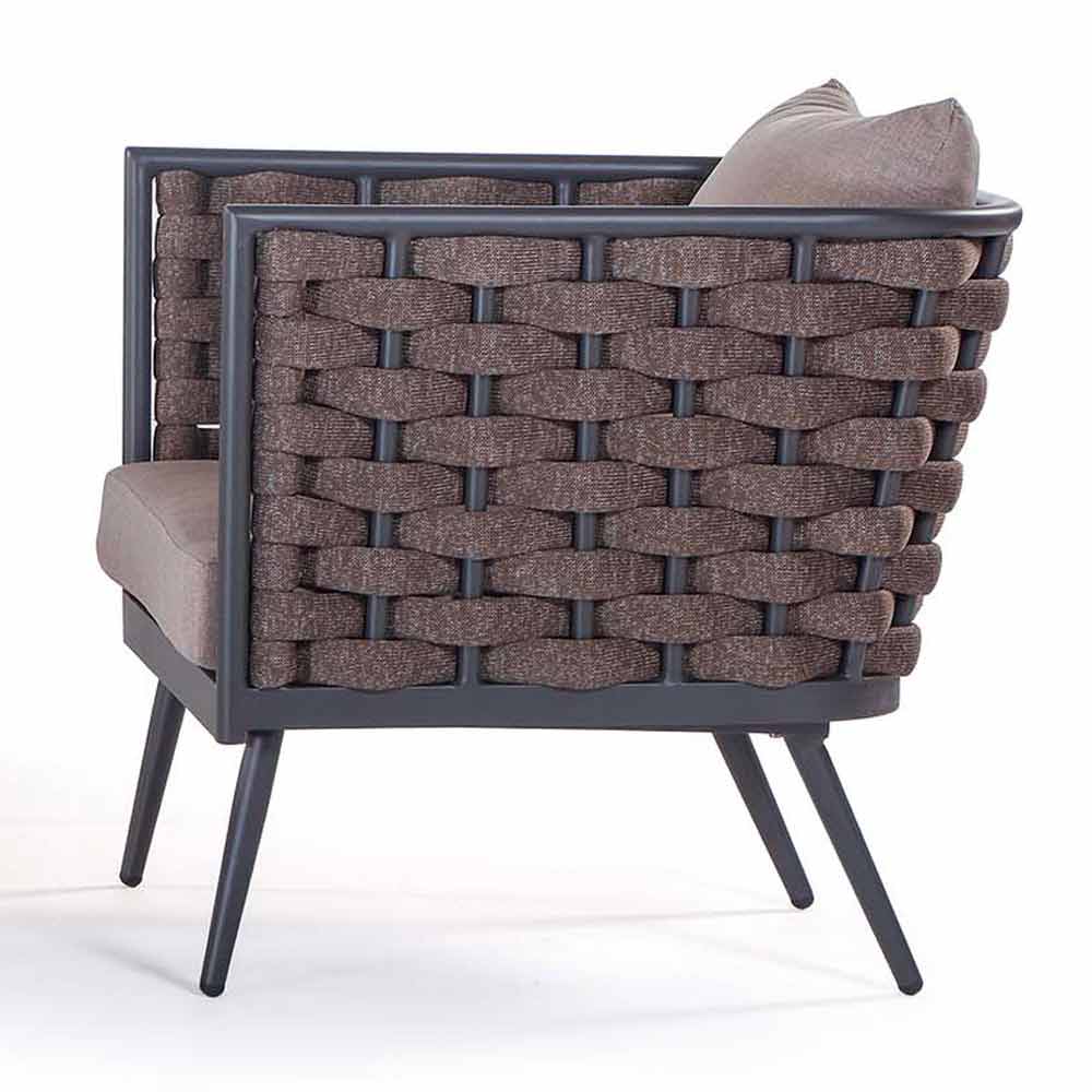 Outdoor-Sessel mit graphitbeschichteter Aluminiumstruktur und Polyesterseilbindung mit Sitz- und Rückenkissen aus braunem Acrylgewebe . Ein Sitz für Außenumgebungen, der Funktionalität und ein angenehmes ästhetisches Erscheinungsbild kombiniert und somit eine perfekte Einrichtungslösung für diejenigen bietet, die ein Produkt suchen, das ebenso komfortabel und einladend wie elegant ist und eine wunderbare Harmonie mit den anderen Elementen von schafft die Möbel umgeben.