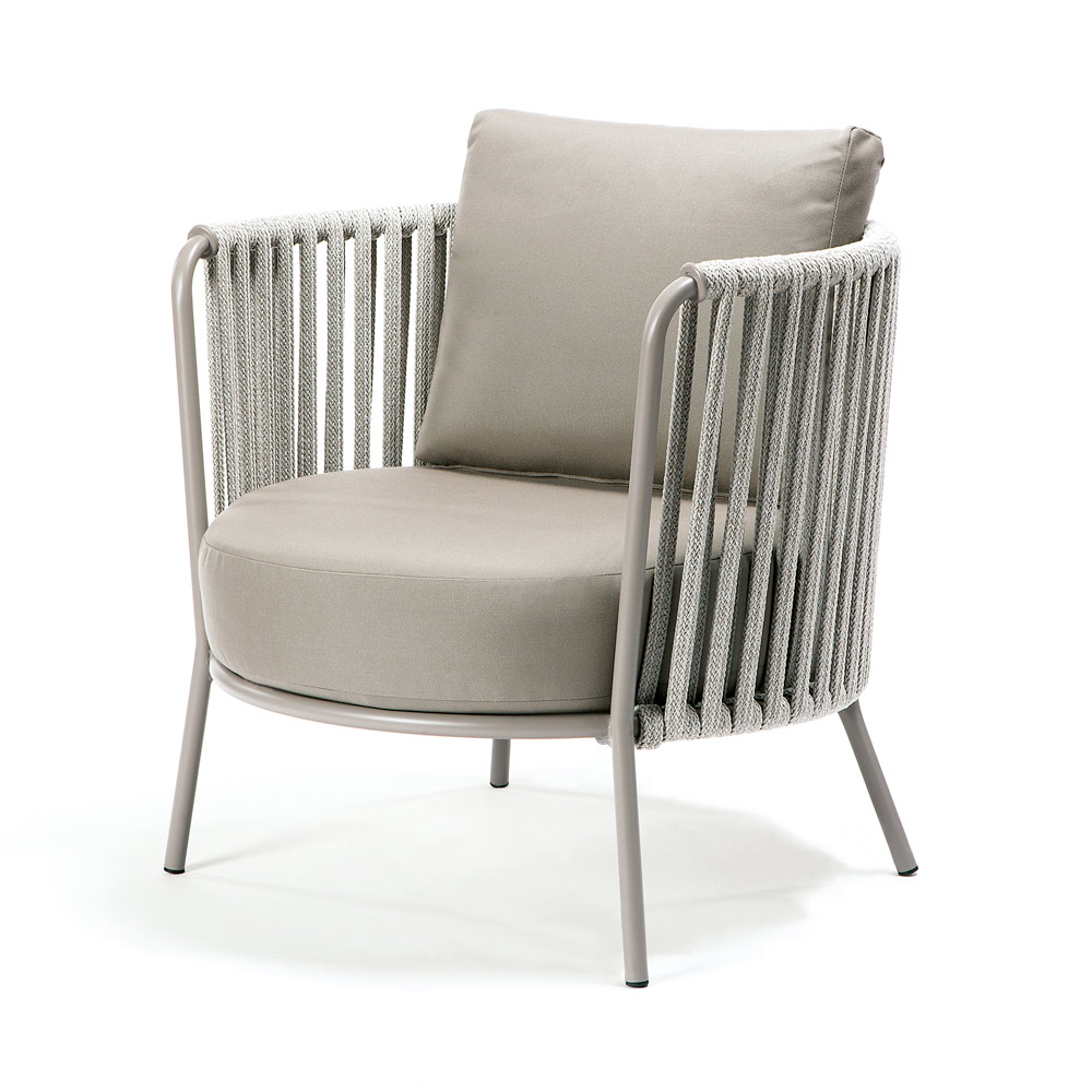 Gartenmöbel - Sessel aus verzinktem Stahl und Seil, handgefertigt in Italien , inklusive Sitz- und Rückenkissen . Die Verzinkung erhöht die Widerstandsfähigkeit der Materialoberfläche gegen korrosive Witterungseinflüsse, während das Seil chlor- und sonnenbeständig sowie schimmelresistent ist. Die Kissen bestehen aus UV- und wasserbeständigem Material, das die Farbe lange erhält und den Sessel zum perfekten Einrichtungselement für jeden Außenbereich macht.