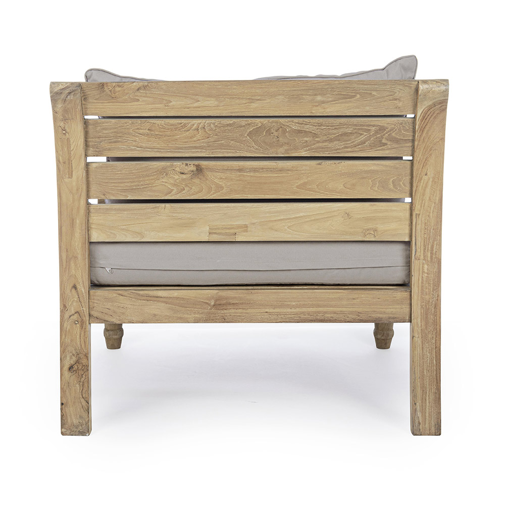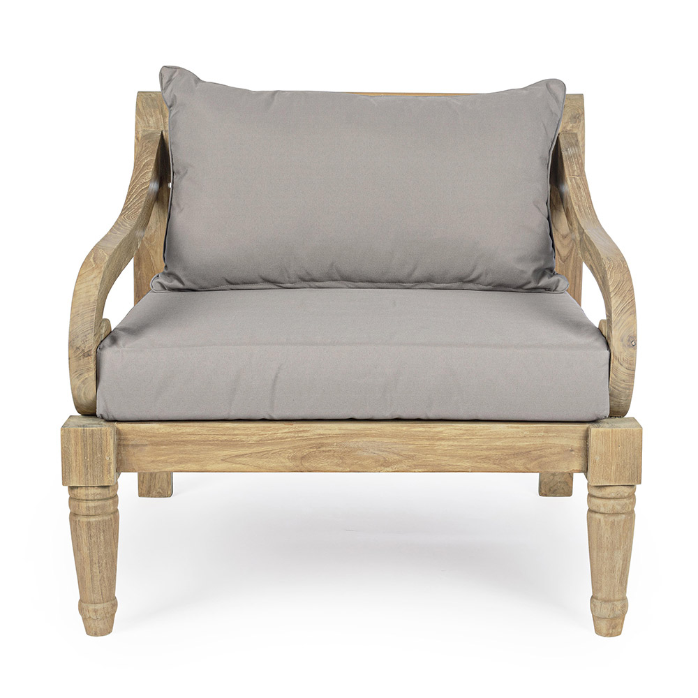 Outdoor-Sessel mit Teakholzstruktur und abnehmbaren Stoffkissen.