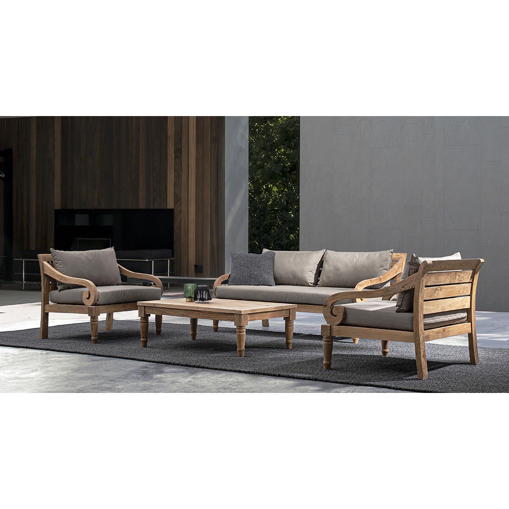 Struktur aus FSC-Teakholz 100% natürliches rustikales Finish. Abnehmbare Kissen aus sonnenfestem Olefingewebe (100% Polypropylen).