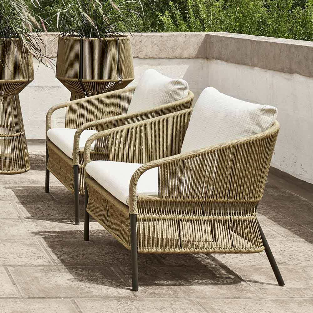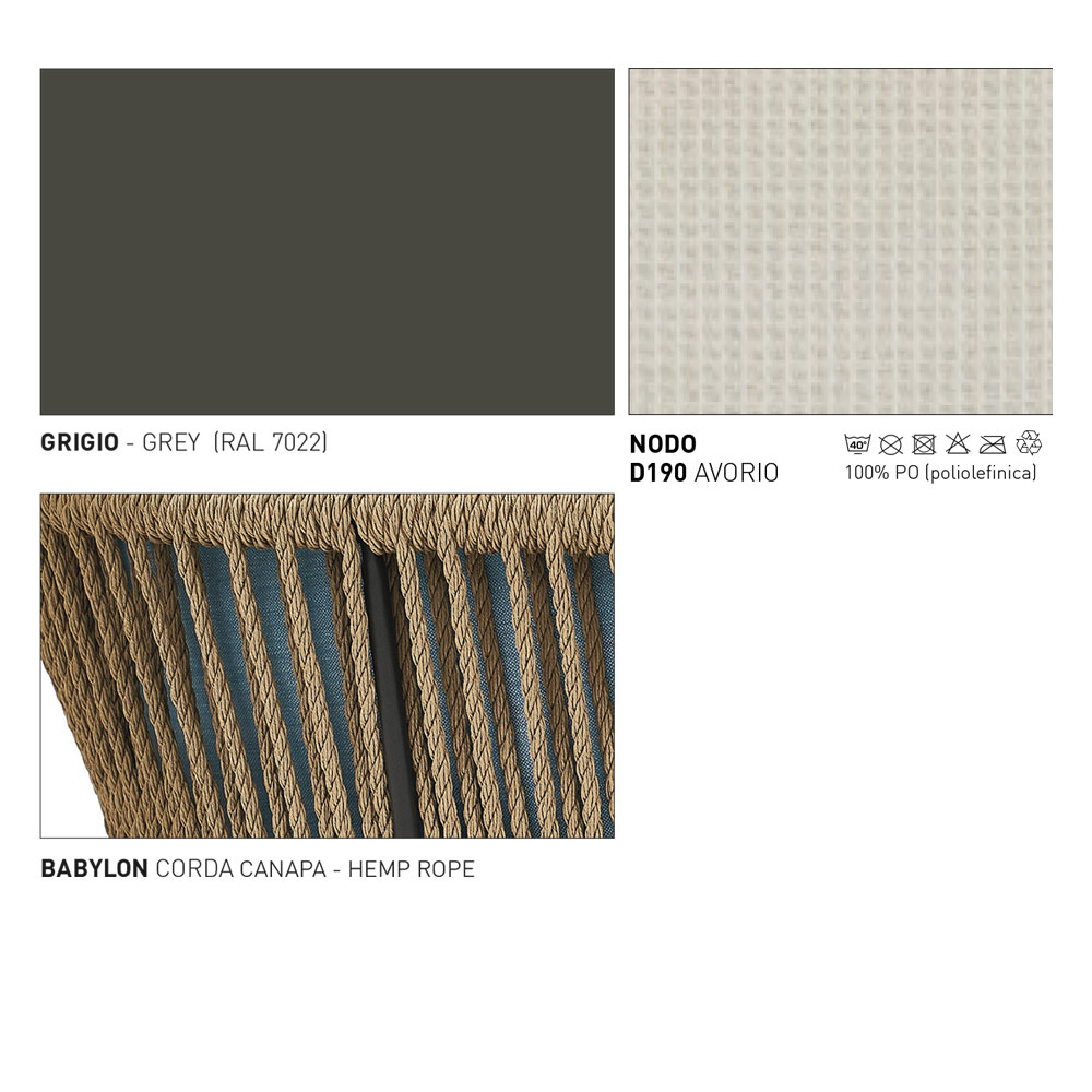 Outdoor-Sessel mit Struktur aus pulverbeschichtetem Aluminium mit grauer Oberfläche , handgewebter Sitzfläche aus hanffarbenem Seil und zwei elfenbeinfarbenen Kissen mit Dryfeel-Polsterung inklusive. Eine innovative und frische Einrichtungslösung, bereichert durch die wunderbaren vorgeschlagenen Oberflächen, die die Außenumgebung mit Raffinesse verwandeln.