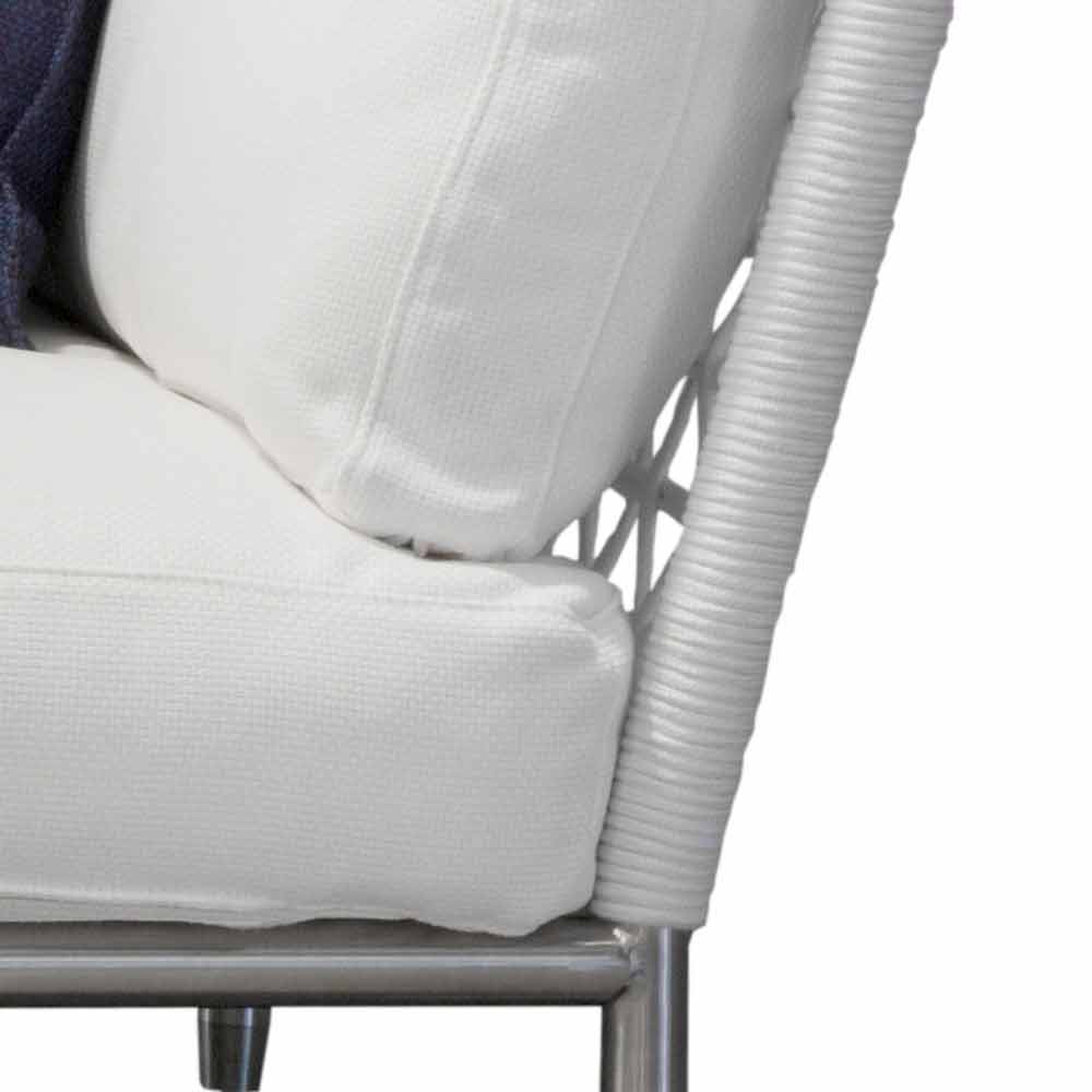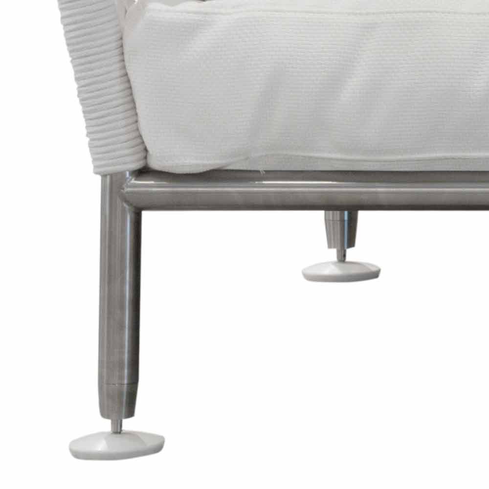 Kissen mit Trockenpolsterung und abnehmbarem Bezug aus Outdoor-Stoff angereichert. Die bruchsicheren Füße bestehen aus weißem Teflon.