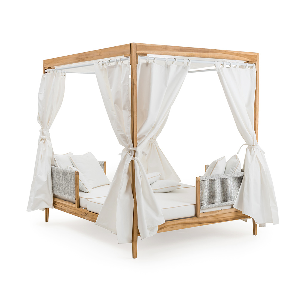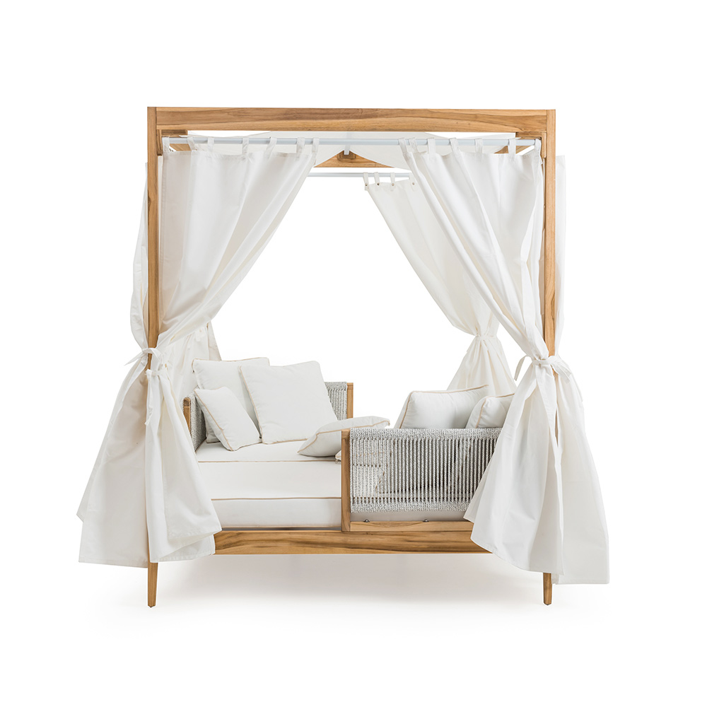 Dieser Outdoor Baldachin kombiniert die Schönheit des Teakholzes mit der Handwerkskunst italienischer Weberei.