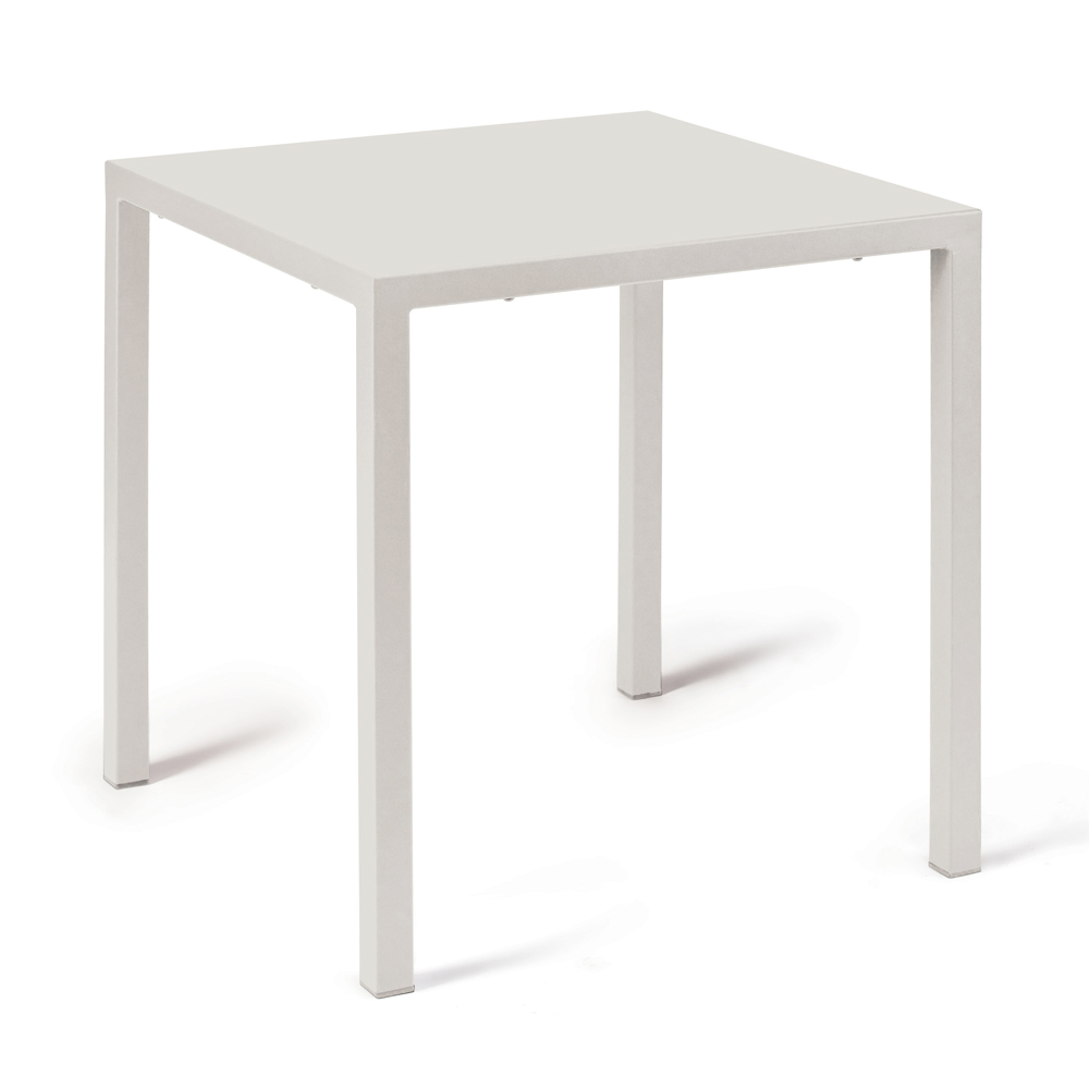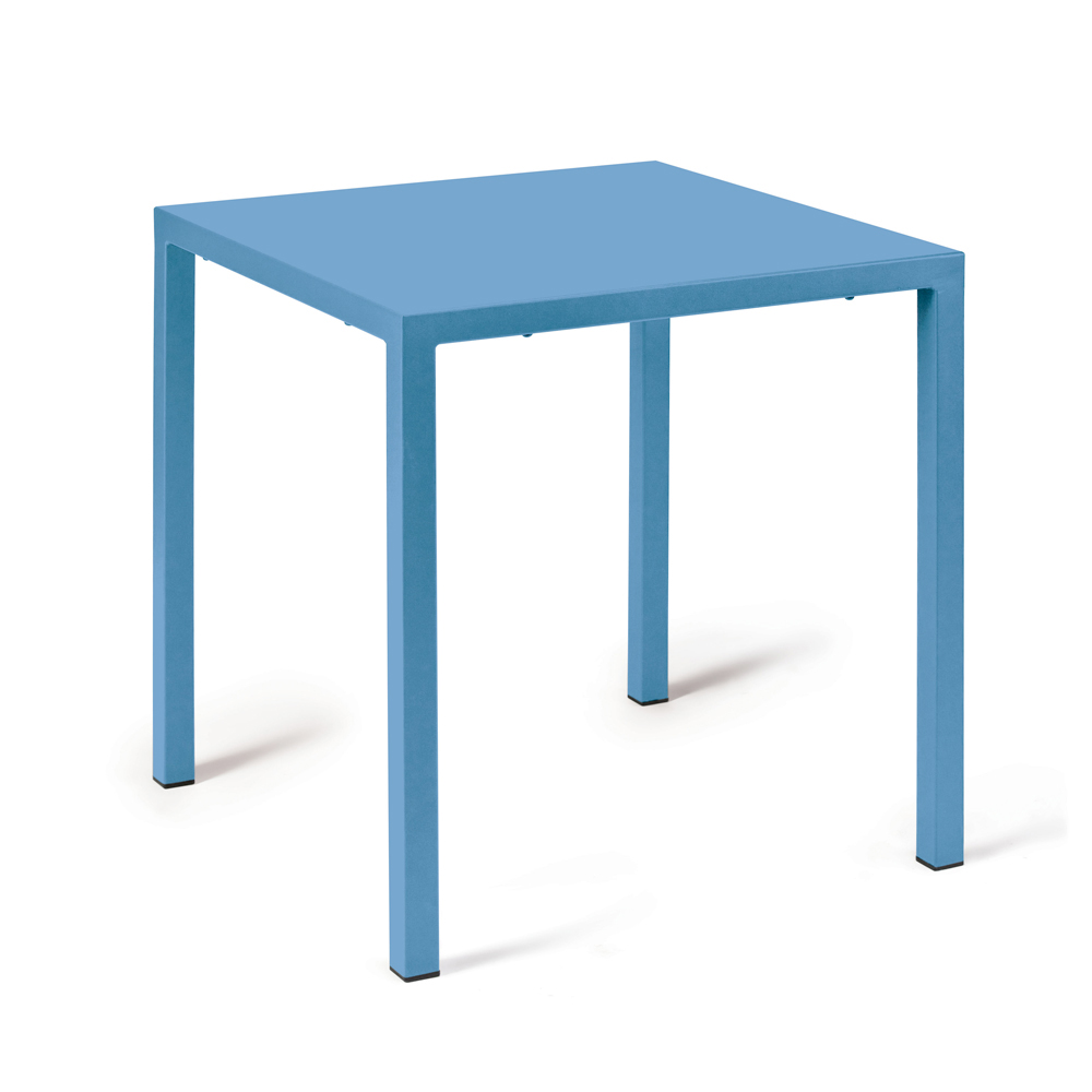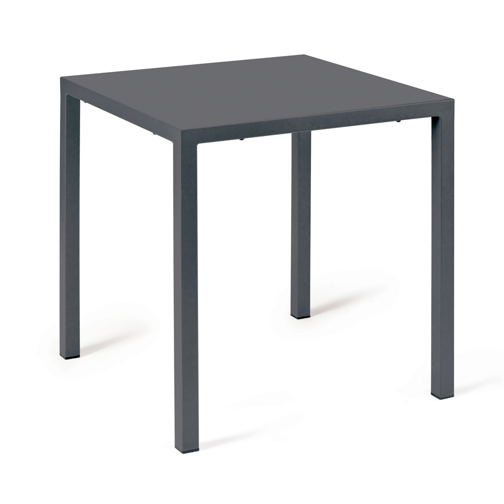 Stapelbarer und selbstnivellierender Esstisch für den Außenbereich. Made in Italy, komplett aus verzinktem Stahl mit quadratischen Beinen und 4 normalen Füßen.