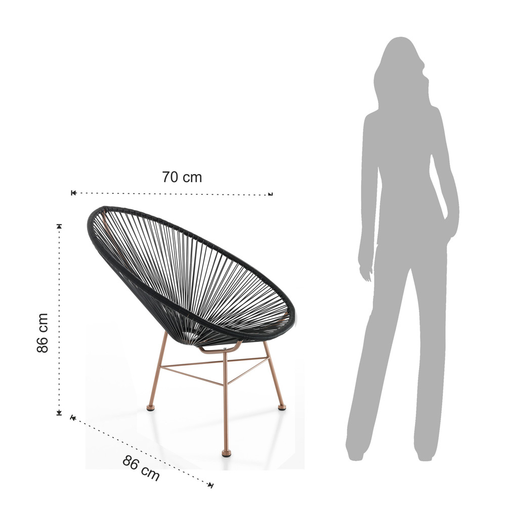 Sessel mit halbglänzend kupferlackiertem Metallgestell und Rückenlehne aus schwarzem Polyrattan-Kordel, komplett aus Metall . Diese Möbel eignen sich perfekt, um sich einzigartige Momente der Ruhe und Entspannung zu gönnen. Die für die Konstruktion gewählten Materialien garantieren einen bequemen und umhüllenden Sitz , aber auch Widerstandsfähigkeit und Funktionalität, um den Sessel sowohl im Innen- als auch im Außenbereich aufzustellen.