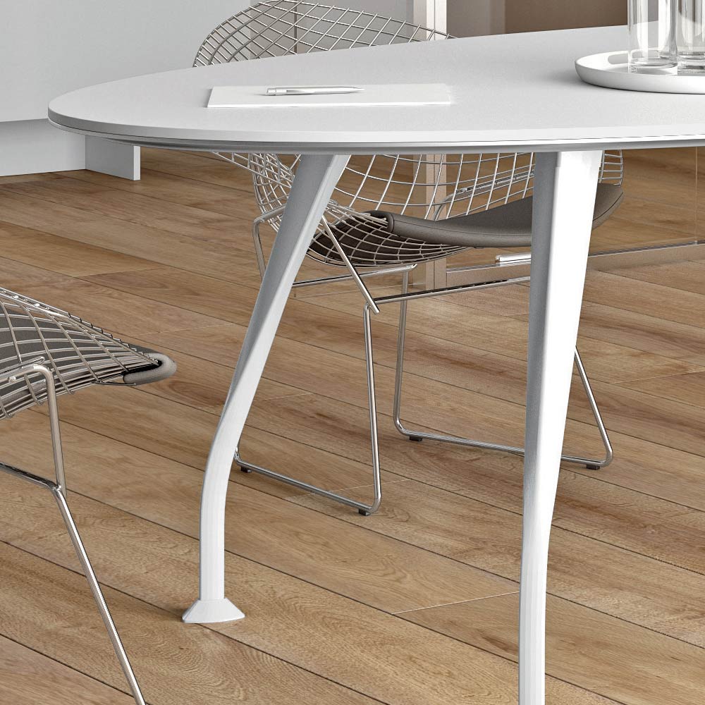 Dieser Tisch besteht aus einer ovalen Melaminplatte in weißer Ausführung und 4 Infinity-Beinen, ebenfalls in mattweißer Ausführung.