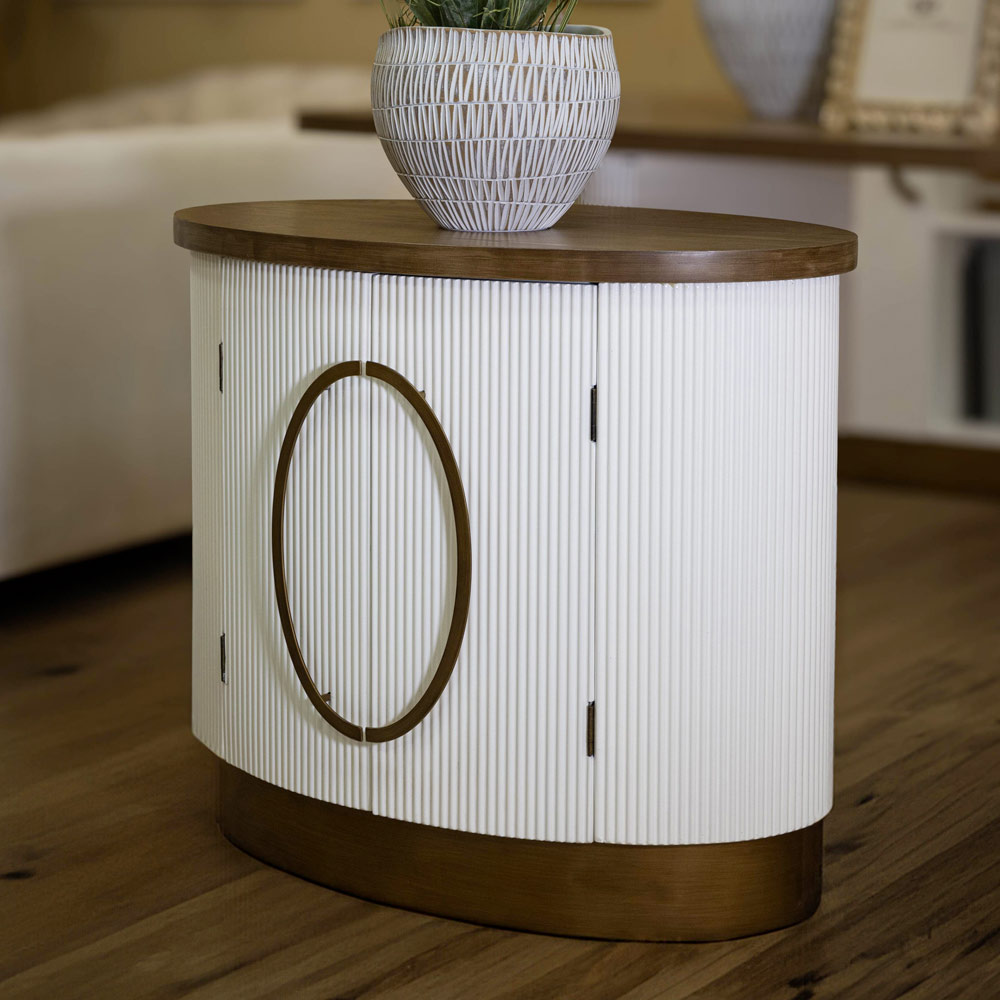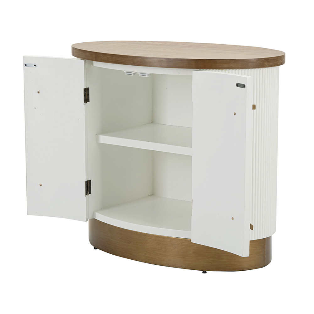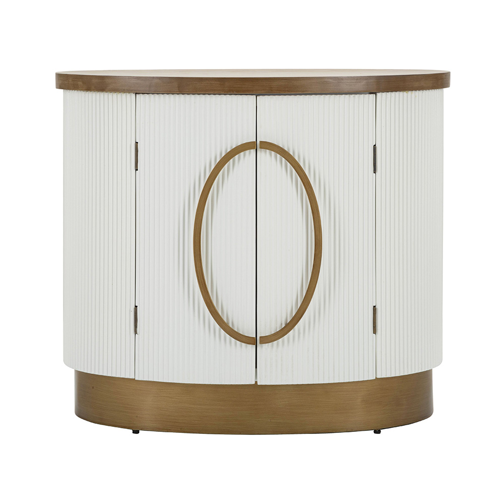 Die raffinierte Rille der Türen sorgt für ein zartes Spiel aus Licht und Schatten, während die runden Griffe für einen Hauch von Raffinesse sorgen. Dieses Möbelstück ist nicht nur ein ästhetischer Blickfang, sondern bietet auch reichlich Stauraum, was es ebenso praktisch wie schön macht.