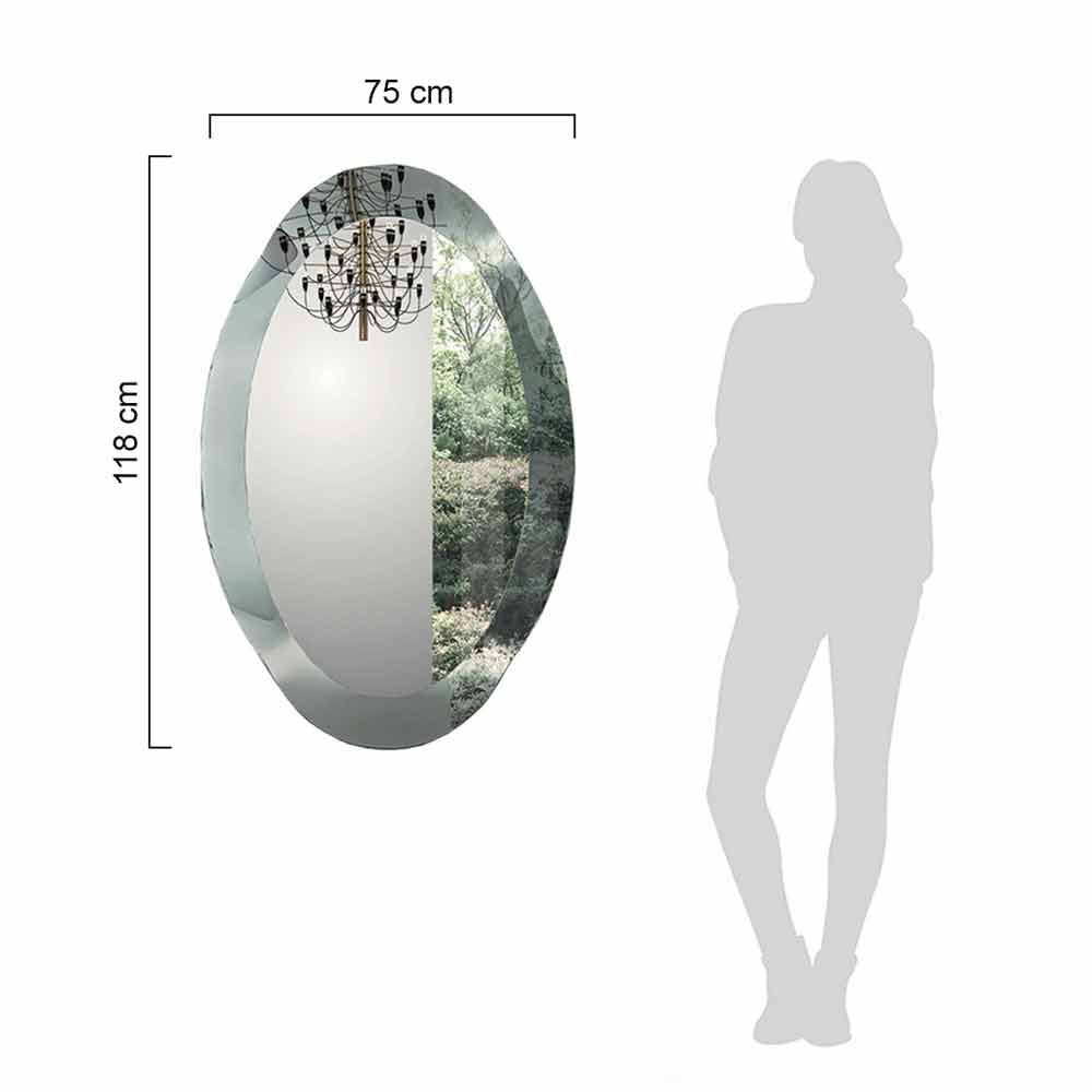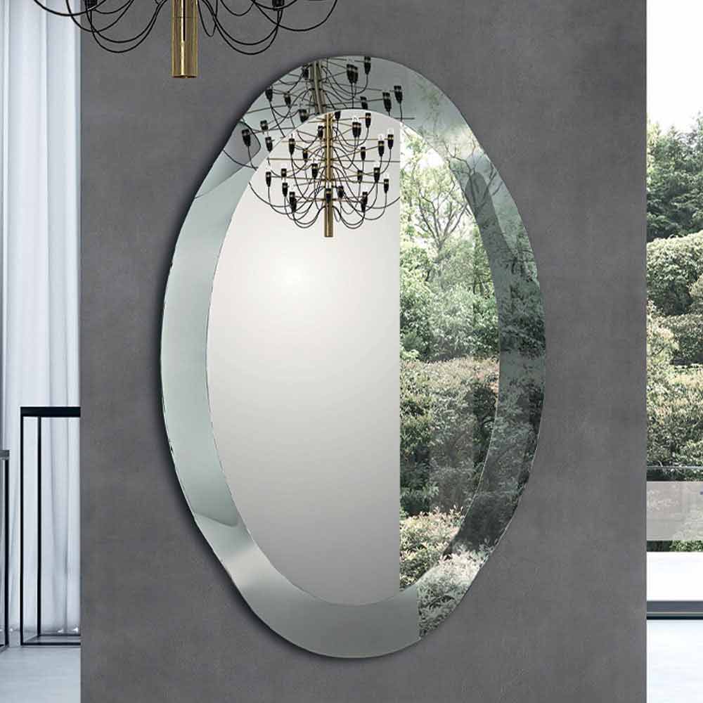 OvalerWandspiegel,hergestellt in Italien , mit Innenspiegel und 6 mm gebogenem Glasrahmen in verspiegelter Kristalloptik . Das Design dieses Einrichtungsaccessoires ist schlicht und äußerst minimalistisch , wird jedoch durch die wundervollen Oberflächen und die unregelmäßige Struktur des Rahmens, die dem Produkt Bewegung und Originalität verleiht, bereichert und einzigartig gemacht. Das Ergebnis ist ein moderner und eleganter Spiegel, der sich ideal für die Positionierung in ebenso modernen Umgebungen eignet, die einen Hauch von Klasse und Stil erfordern.
