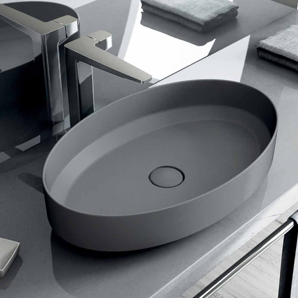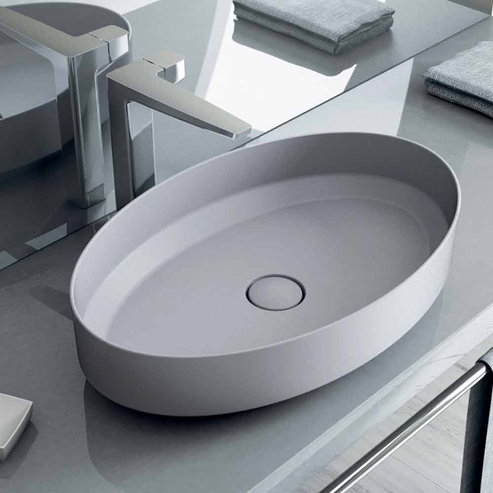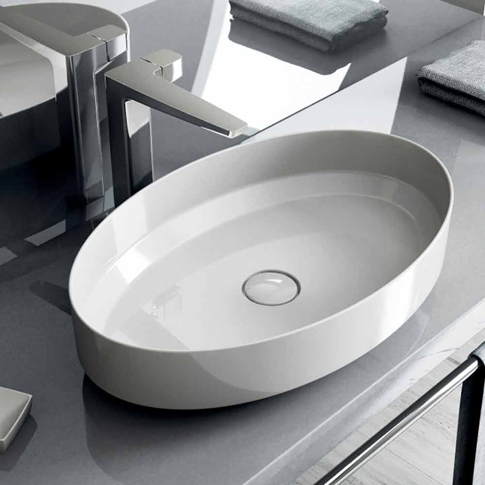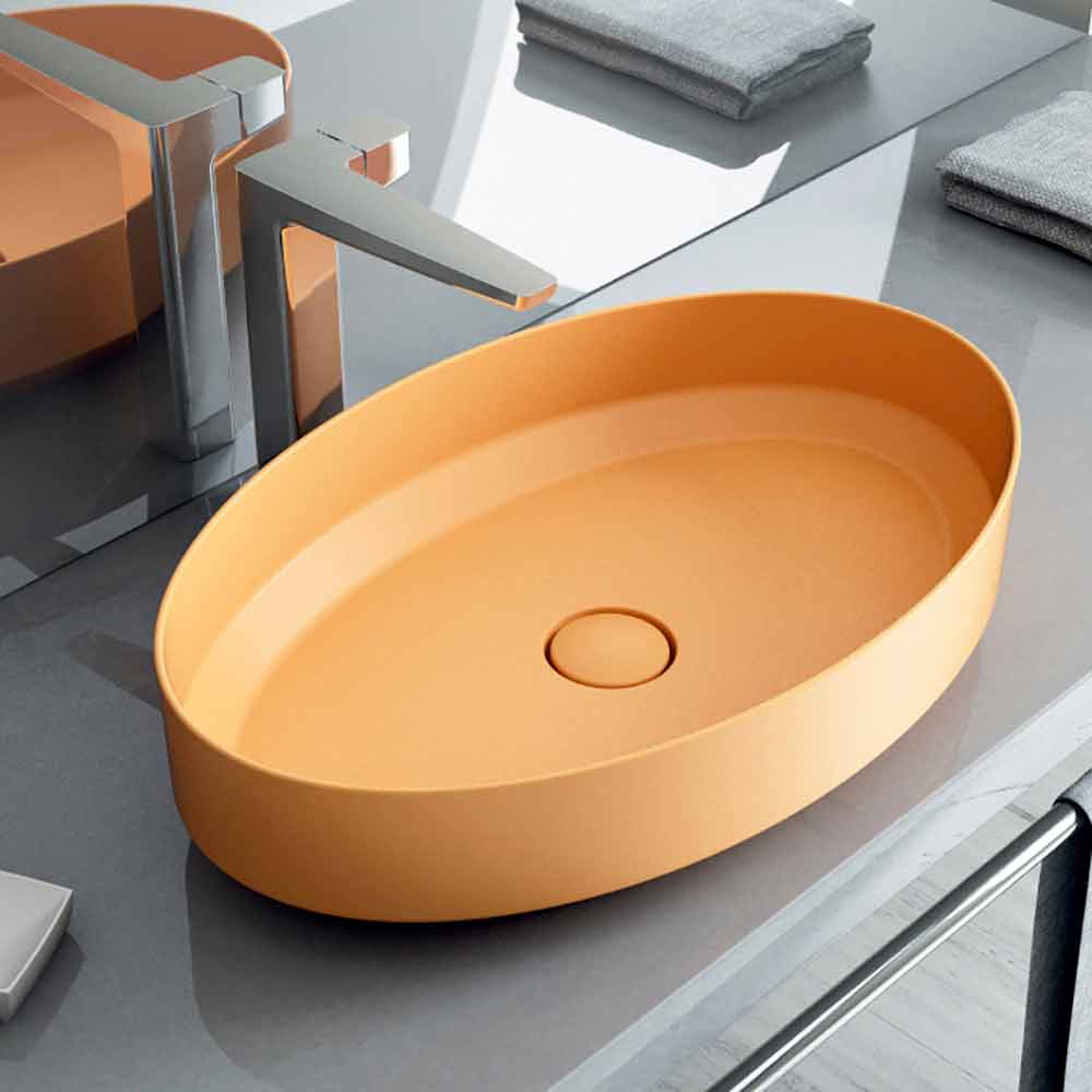 Yoel ist ein außergewöhnliches ovales Aufsatzwaschbecken, das in Italien in Keramik handgefertigt wird und sich durch ein elegantes und vielseitiges Design auszeichnet, das sich perfekt für jede Art von Badezimmer eignet.