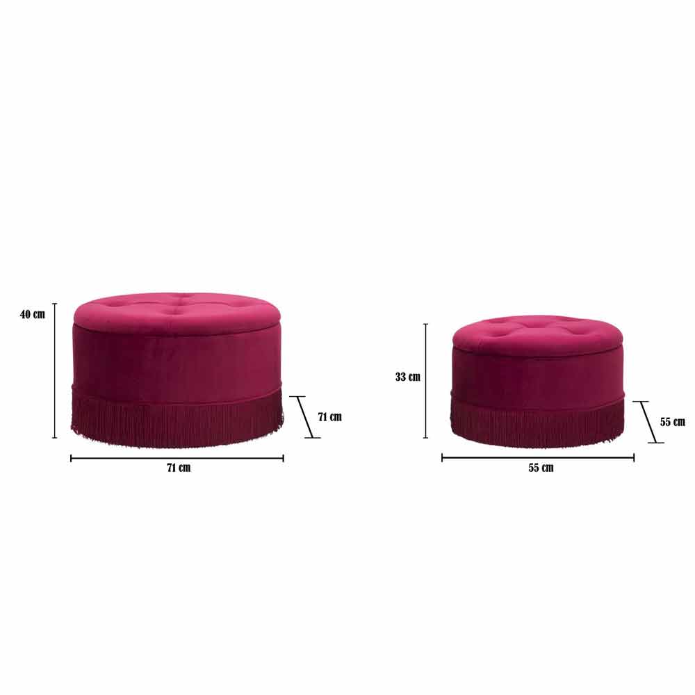 Paar Sitzpuffs mit burgunderfarbenem Behälter aus Holz mit Design-Samtsitz.