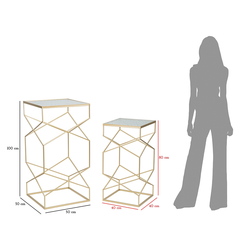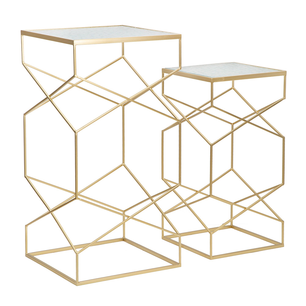 2 quadratische Telefontische aus goldfarbenem Eisen mit geometrischen Linien, die ein Gefühl von Tiefe erzeugen, komplett mit fein gearbeiteter Glasplatte.