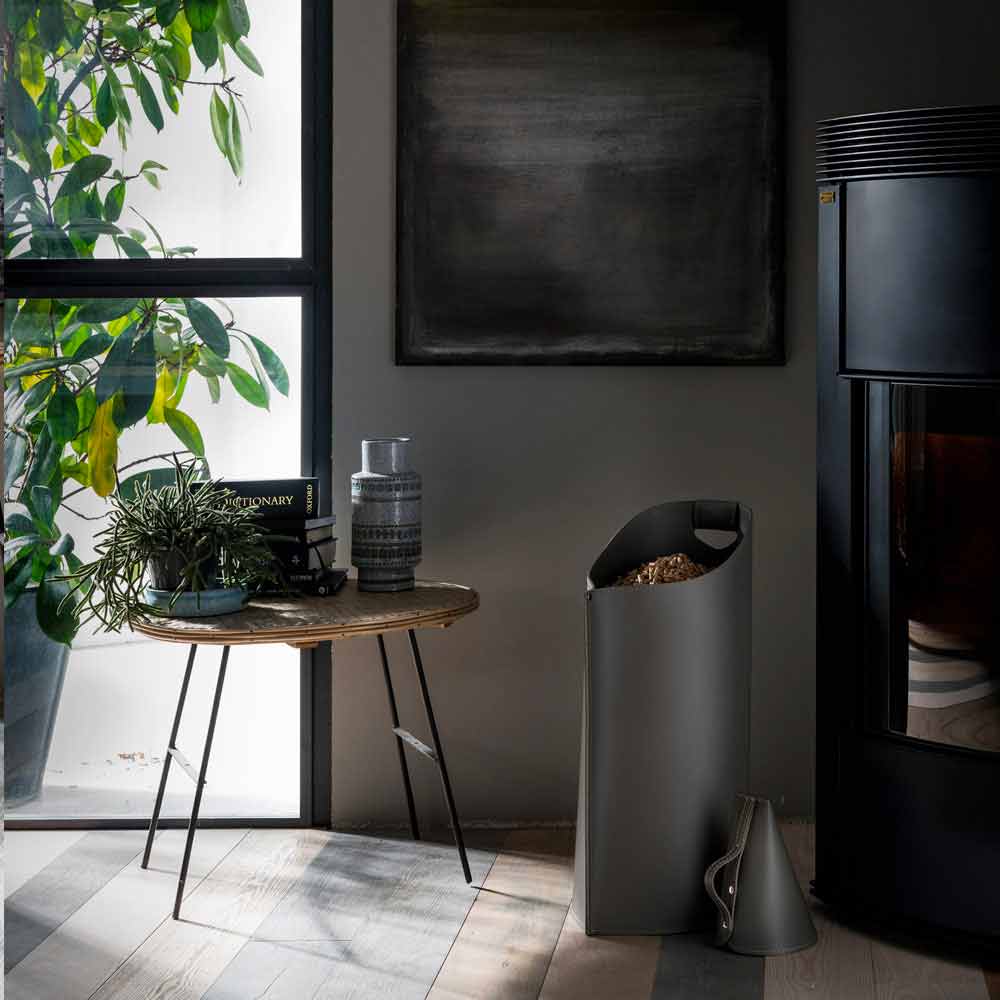 moderner Pelletkorb aus schwarzen Leder mit Pelletschaufel – Sapir Design